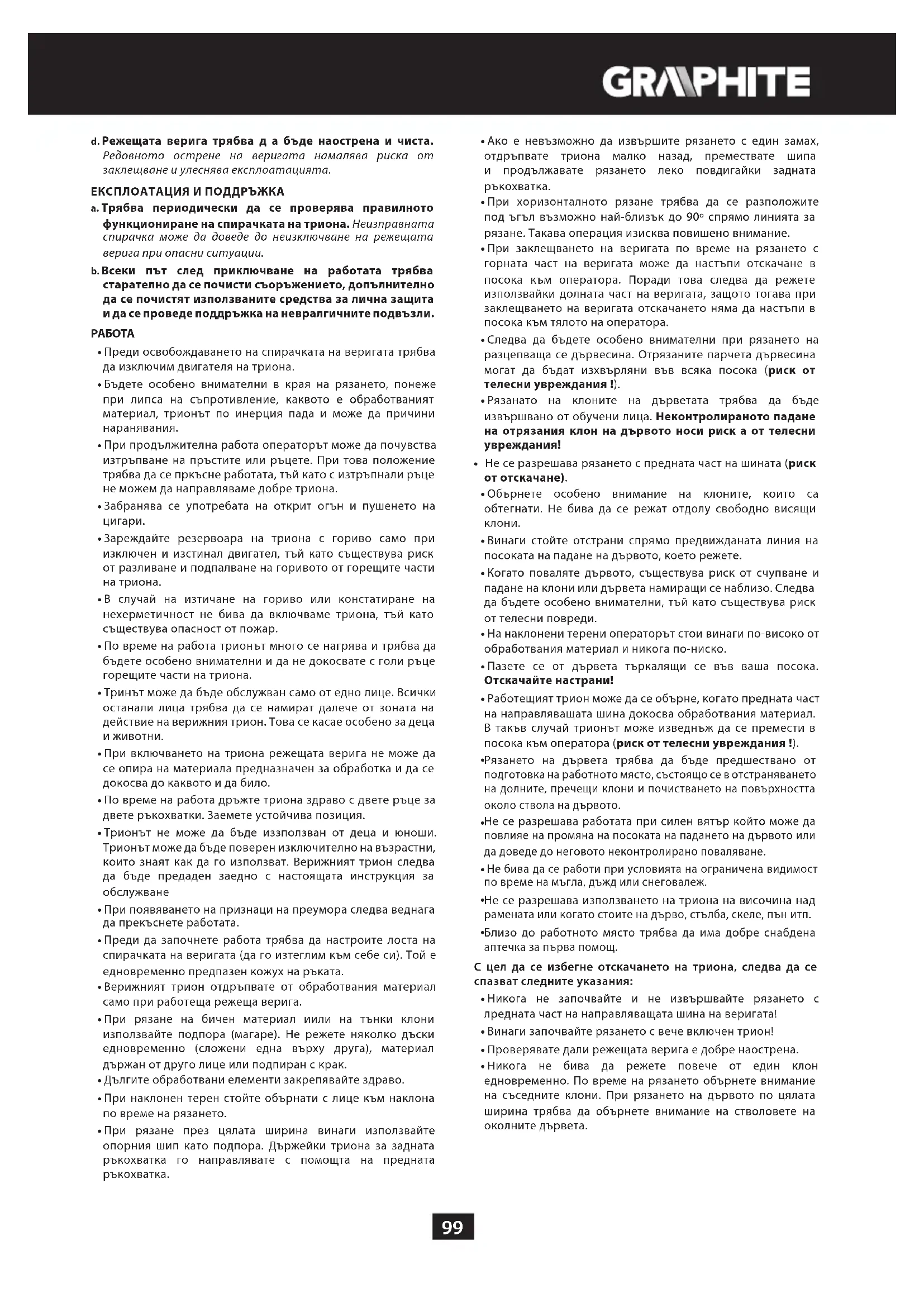 - Производителят не носи отговорност за щети произлизащи от неправилната експлоатация на верижния трион. РАБОТНО МЯСТО a. На работното място следва да се поддържа порядък и да се осигури добро осветление. Безпорядъкът и лошото осветеление могат да доведат до нещастни случаи особено при употребата на верижни триони. b. Да не се допускат деца и странични наблюдатели до работното място. Невниманието на оператора може да доведе до загубата на контрол върху уреда. ЛИЧНА БЕЗОПАСНОСТ a. Трябва да се използват защитни средства – работен комбинезон, предпазни очила, предпазни обувки, предпазна каска, предпазни наушници и кожени ръкавици. Използването при определени условия на защитни средства намалява риска от телесни увреждания. b. Не надценявайте своите възможности. Трябва през цялото време да стоите стабилно и да пазите равновесие. Това улеснява контрола над триона при непредвидени ситуации. c. Не се разрешава носенето на свободно висящи дрехи или бижута. Косата, дрехите и ръкавиците трябва да са далече от движещите се части. Свободно висящите дрехи, бижутата и косата могат да се заплетат в подвижните части. ТРАНСПОРТ И СЪХРАНЯВАНЕ a. Пренасяйки триона трябва да изключим двигателя, да сложим кожуха на режещата верига и да включим спирачката на веригата. Пренасянето на включен и незащитен трион може да доведе до телесни увреждания. b. Пренасянето на триона е възможно единствено държейки го за предната ръкохватка. Държенето на триона за други места не е сигурно и може да причини наранявания.. c. Триона трябва да се контролира. Проверявайте закрепването на подвижните елементи, дали няма повредени части и всички други фактори, които биха могли да повлияят на работзта на триона. В случай, че бъдат констатирани повреди, необходимо е те да бъдат отстранени преди употребата на триона. Неправилният начин на поддръжка на уреда може да бъде причина за много нещастни случаи.99 d. Режещата верига трябва д а бъде наострена и чиста. Редовното острене на веригата намалява риска от заклещване и улеснява експлоатацията. ЕКСПЛОАТАЦИЯ И ПОДДРЪЖКА a. Трябва периодически да се проверява правилното функциониране на спирачката на триона. Неизправната спирачка може да доведе до неизключване на режещата верига при опасни ситуации. b. Всеки път след приключване на работата трябва старателно да се почисти съоръжението, допълнително да се почистят използваните средства за лична защита и да се проведе поддръжка на невралгичните подвъзли.