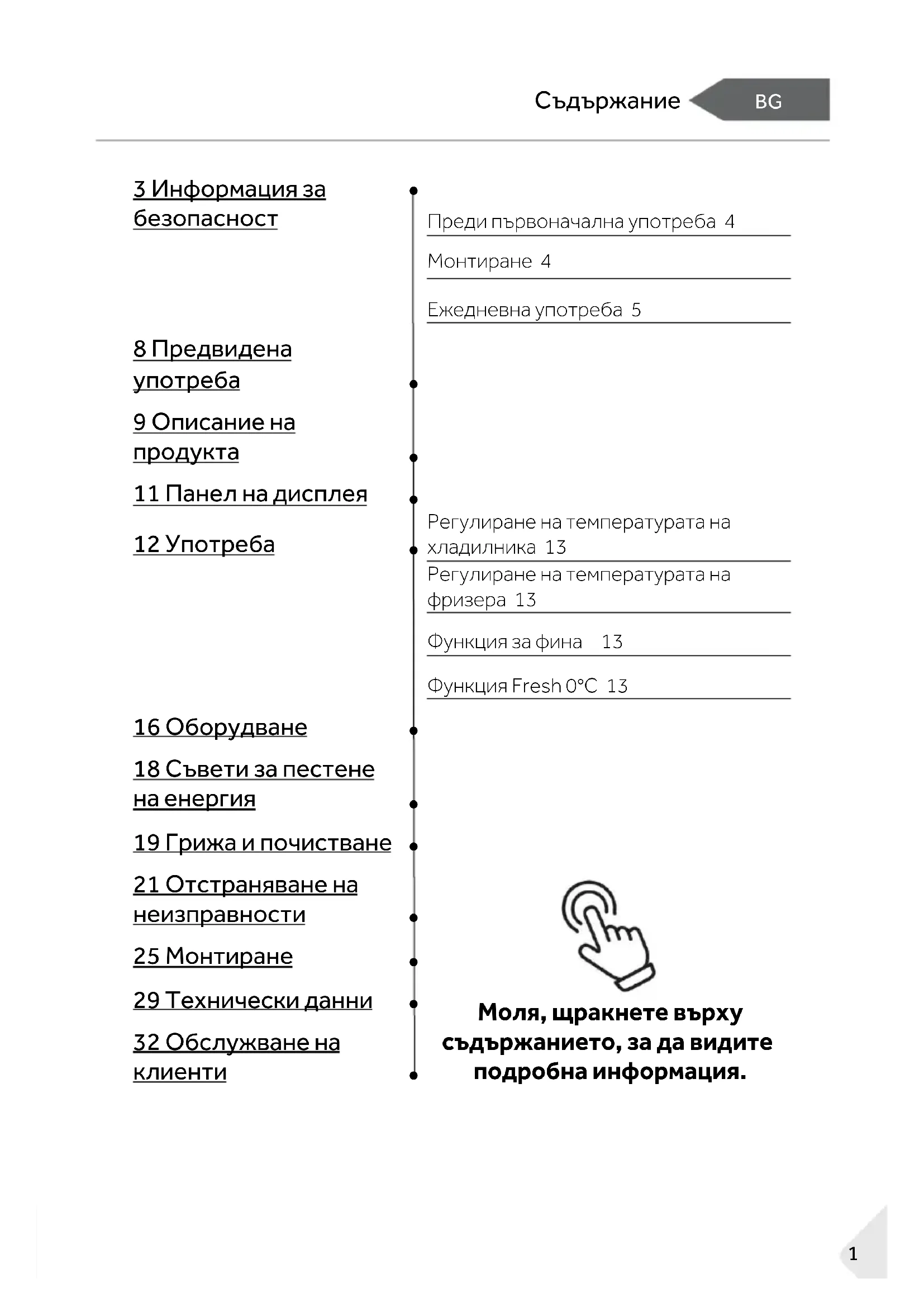 Дисплей за температурата на хладилника Преди първоначална употреба ► Отстранете всички опаковъчни материали, дръжте ги далеч от деца, и ги изхвърлете по природосъобразен начин. ► Почистете уреда отвътре и отвън, както и вътрешността и аксесоарите, с вода и мек почистващ препарат и подсушете добре с мека кърпа. ► След като уредът е нивелиран и почистен, моля, изчакайте поне 2 часа, преди да го свържете към захранването. Вижте раздел „МОНТИРАНЕ“. ► Преди да заредите с храна, предварително охладете отделенията при високи настройки.BG