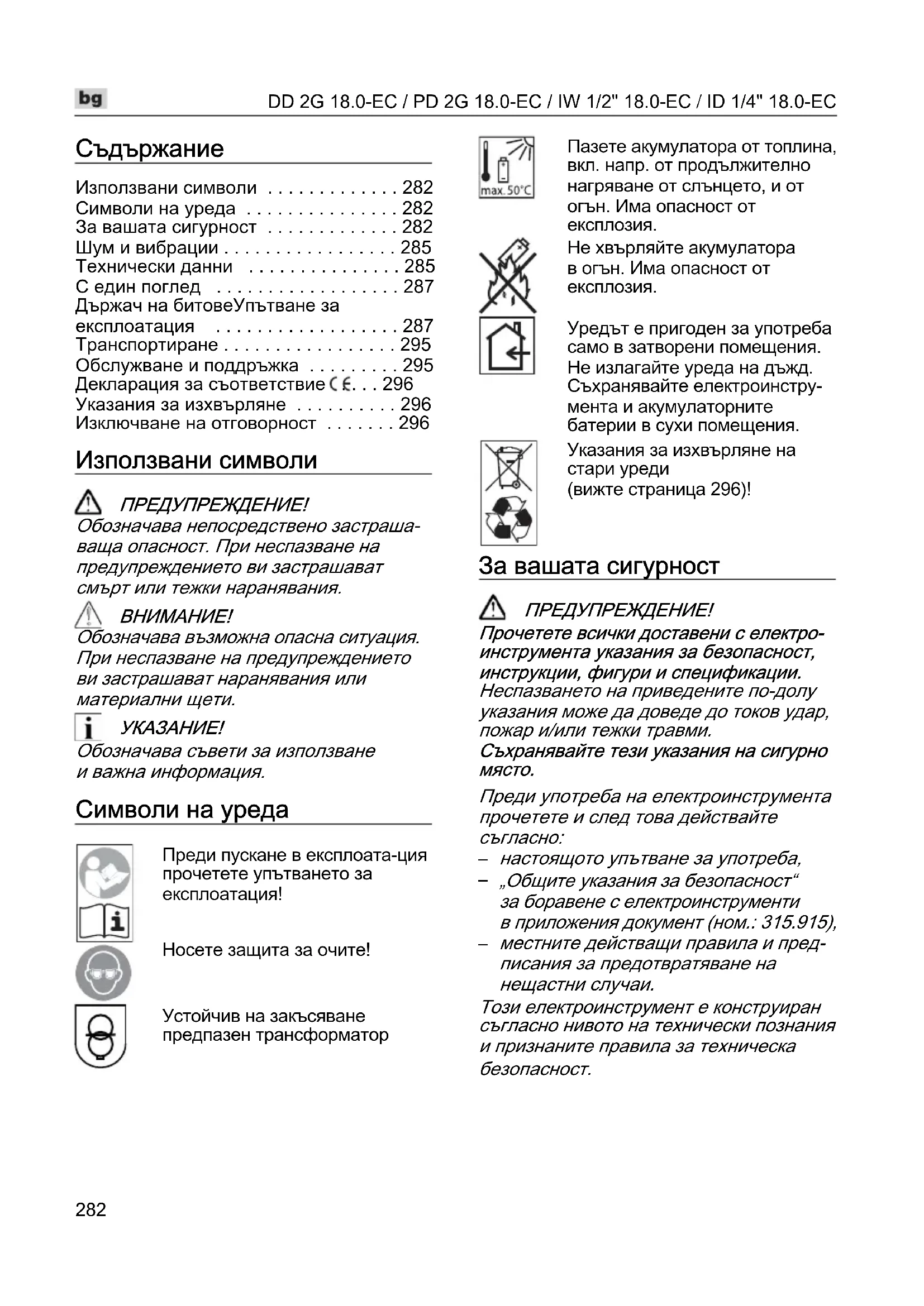 - Изключване на отговорност Използвани символи ПРЕДУПРЕЖДЕНИЕ! Обозначава непосредствено застраша- ваща опасност. При неспазване на предупреждението ви застрашават смърт или тежки наранявания. p. 296