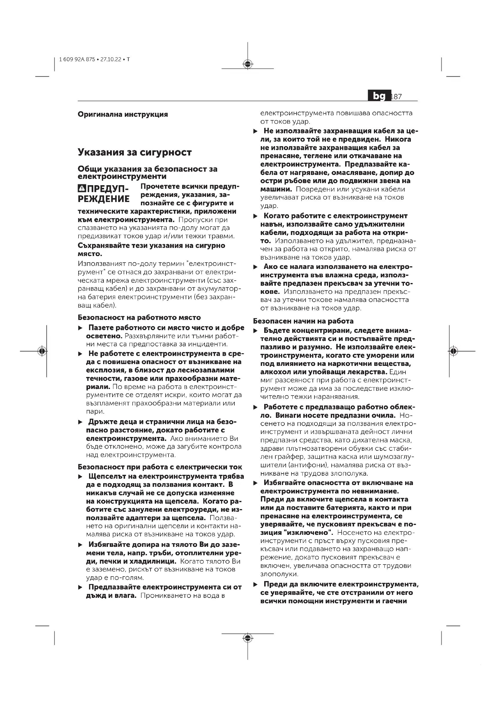 u Преди да включите електроинструмента, се уверявайте, че сте отстранили от него всички помощни инструменти и гаечни bg 187 1 609 92A 875 • 27.10.22 • Tключове. Помощен инструмент, забравен на въртящо се звено, може да причини трав-