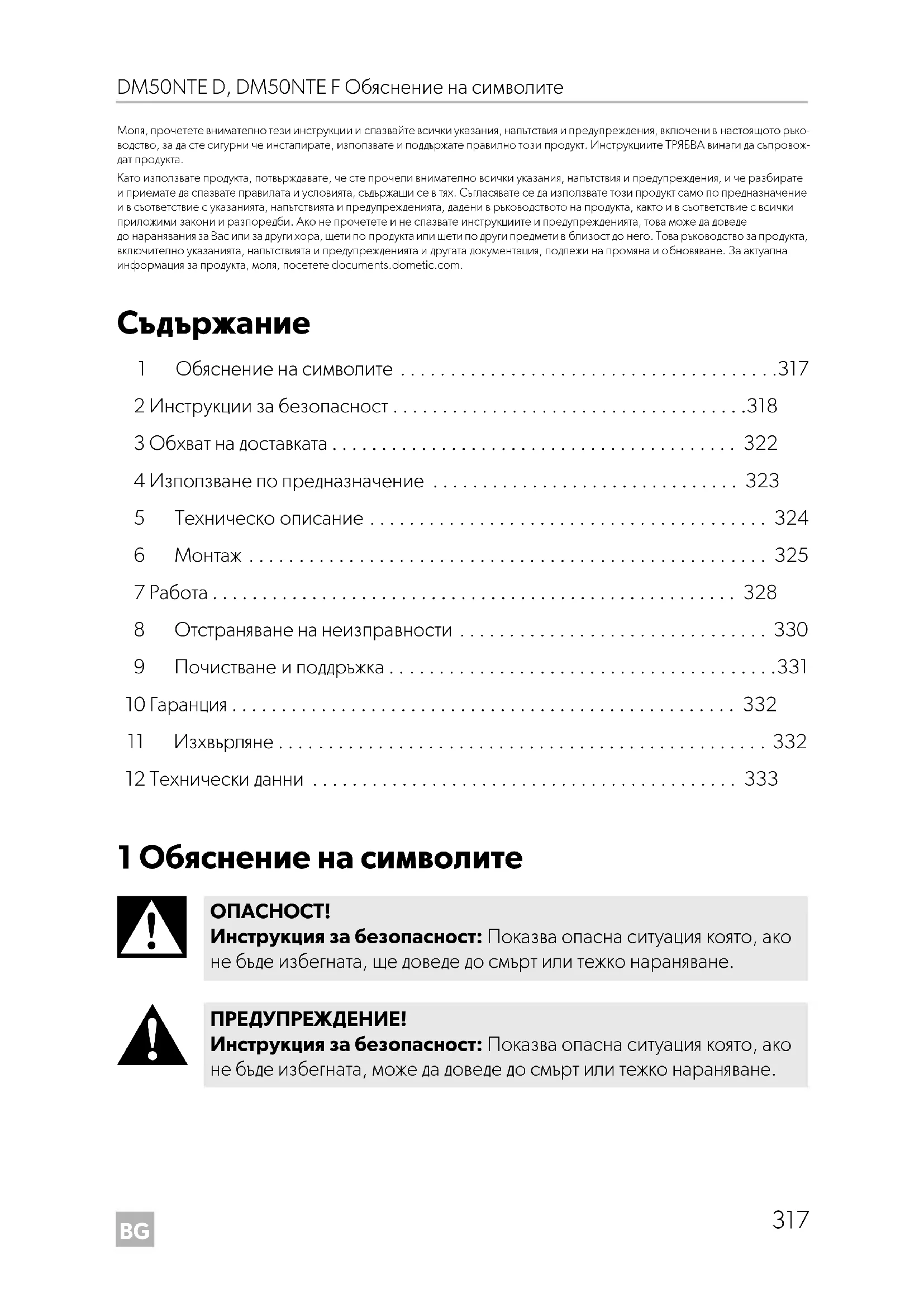 Инструкция за безопасност: Показва опасна ситуация която, ако не бъде избегната, ще доведе до смърт или тежко нараняване. ПРЕДУПРЕЖДЕНИЕ! Инструкция за безопасност: Показва опасна ситуация която, ако не бъде избегната, може да доведе до смърт или тежко нараняване.BG Инструкции за безопасност DM50NTE D, DM50NTE F