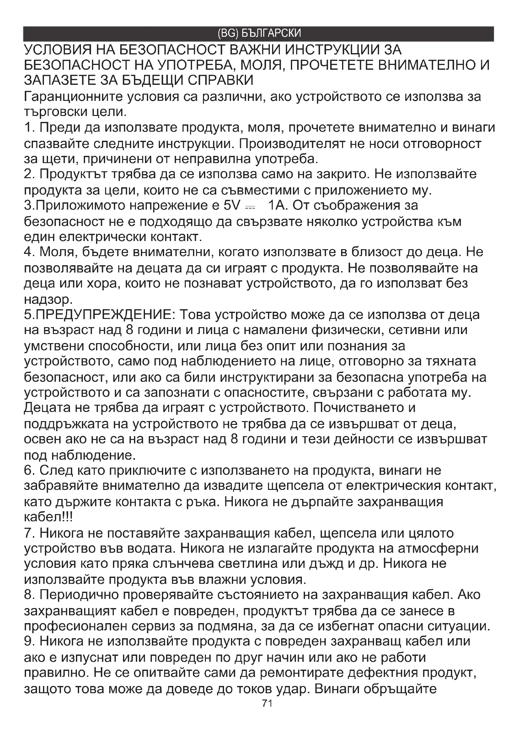 5.ПРЕДУПРЕЖДЕНИЕ: Това устройство може да се използва от деца на възраст над 8 години и лица с намалени физически, сетивни или умствени способности, или лица без опит или познания за устройството, само под наблюдението на лице, отговорно за тяхната безопасност, или ако са били инструктирани за безопасна употреба на устройството и са запознати с опасностите, свързани с работата му. Децата не трябва да играят с устройството. Почистването и поддръжката на устройството не трябва да се извършват от деца, освен ако не са на възраст над 8 години и тези дейности се извършват под наблюдение.