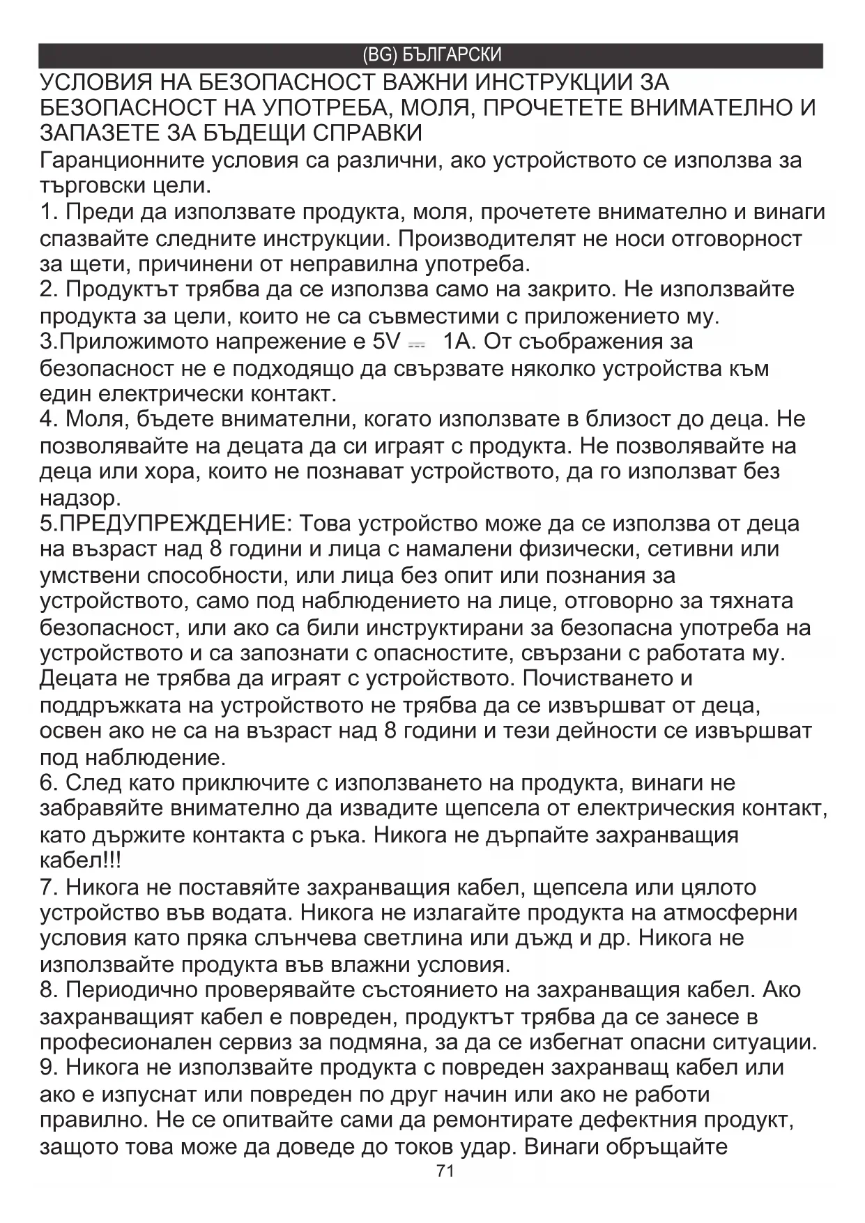 5.ПРЕДУПРЕЖДЕНИЕ: Това устройство може да се използва от деца на възраст над 8 години и лица с намалени физически, сетивни или умствени способности, или лица без опит или познания за устройството, само под наблюдението на лице, отговорно за тяхната безопасност, или ако са били инструктирани за безопасна употреба на устройството и са запознати с опасностите, свързани с работата му. Децата не трябва да играят с устройството. Почистването и поддръжката на устройството не трябва да се извършват от деца, освен ако не са на възраст над 8 години и тези дейности се извършват под наблюдение. 3.Приложимото напрежение е 5V 1A. От съображения за безопасност не е подходящо да свързвате няколко устройства към един електрически контакт.