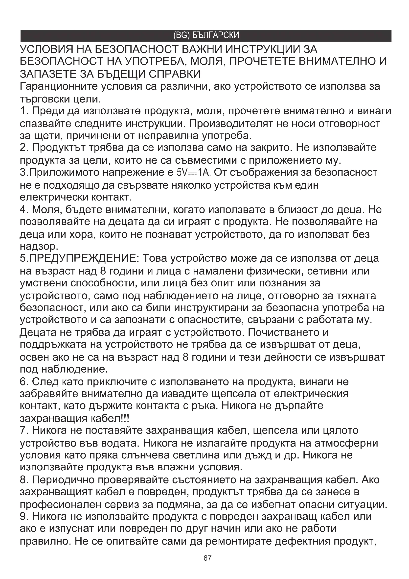5.ПРЕДУПРЕЖДЕНИЕ: Това устройство може да се използва от деца на възраст над 8 години и лица с намалени физически, сетивни или умствени способности, или лица без опит или познания за устройството, само под наблюдението на лице, отговорно за тяхната безопасност, или ако са били инструктирани за безопасна употреба на устройството и са запознати с опасностите, свързани с работата му. Децата не трябва да играят с устройството. Почистването и поддръжката на устройството не трябва да се извършват от деца, освен ако не са на възраст над 8 години и тези дейности се извършват под наблюдение.
