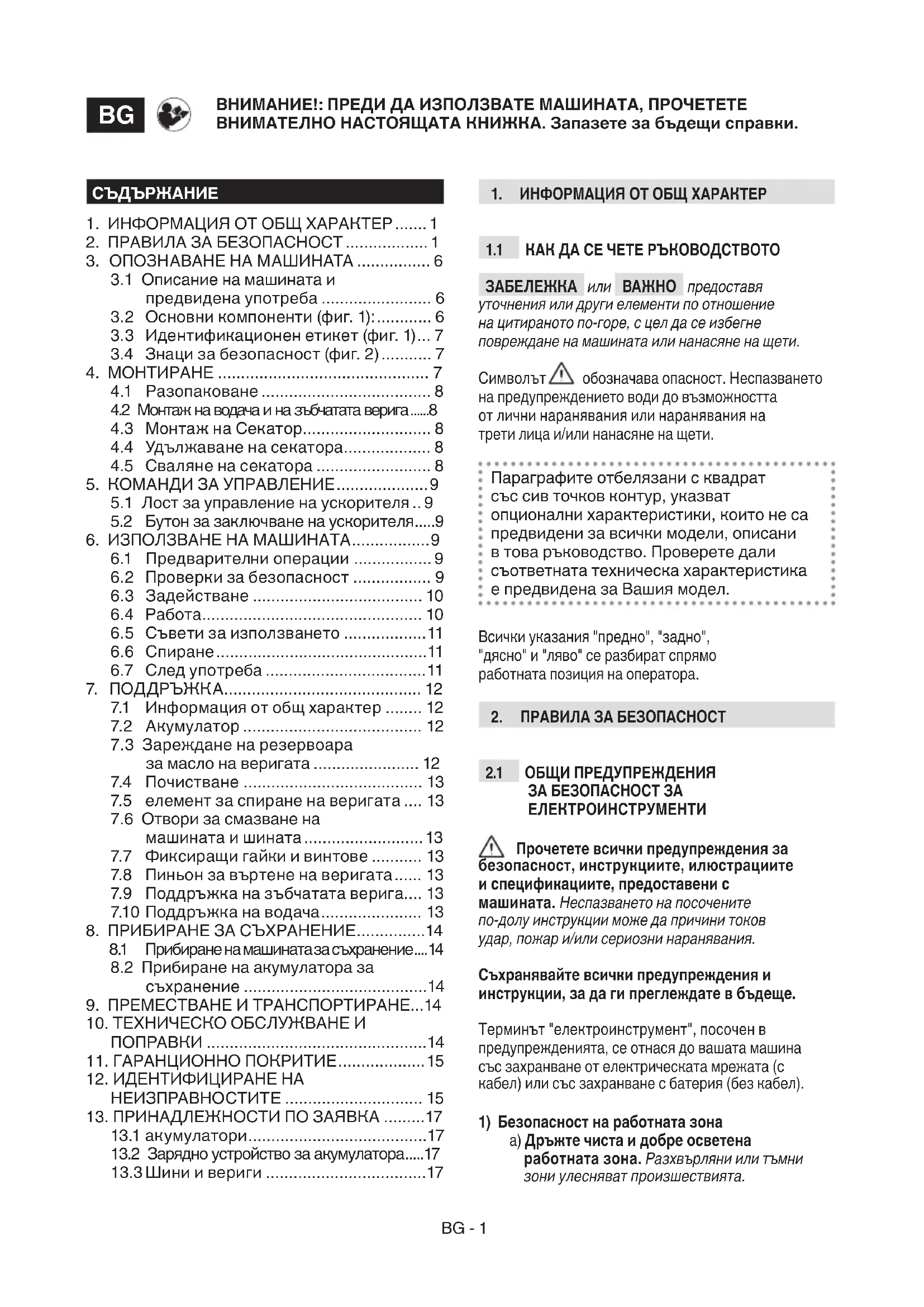 ⚠️ Тъй като изборът, приложението и използването на щангата и веригата са действия, извършени от потребителя при пълната му автономия на преценка, той също така поема отговорността за последствията от всякакъв характер на щетите, произтичащи от тези действия. В случай на съмнения или слабо познаване на спецификата на всяка шина или верига, трябва да се свържете с вашия дилър или специализиран център за градинарство.
