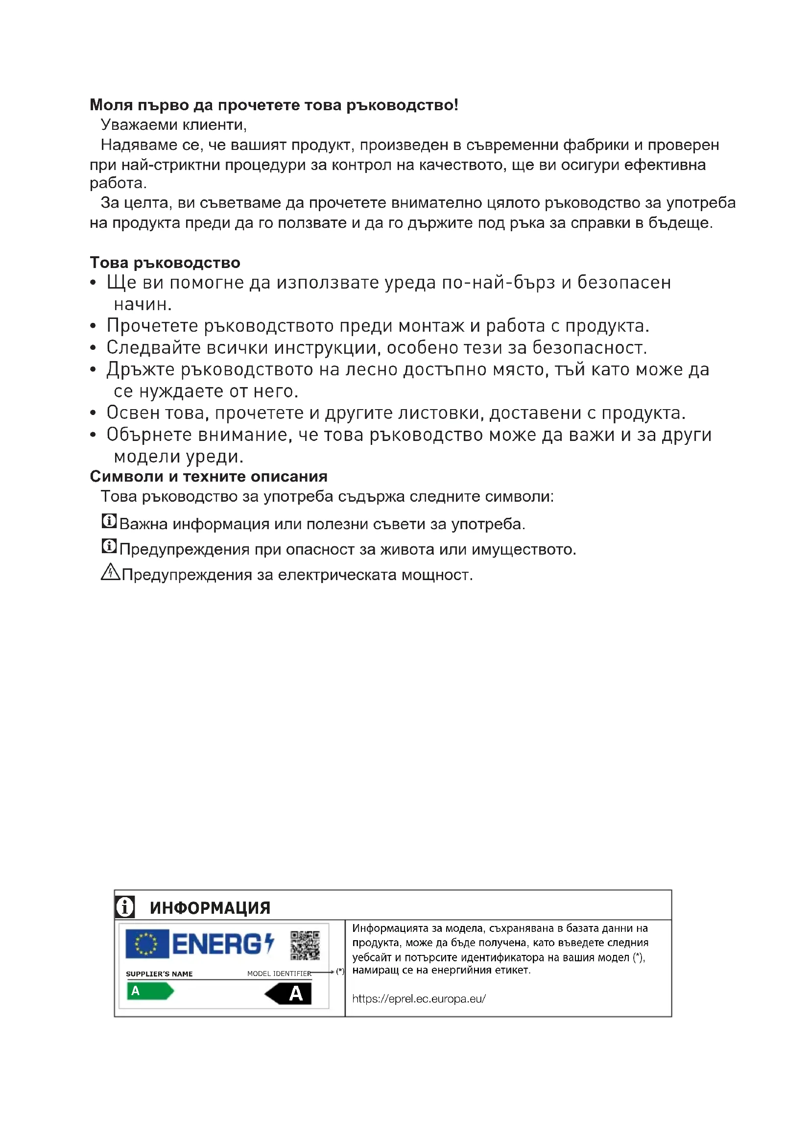 - Прочетете ръководството преди монтаж и работа с продукта.