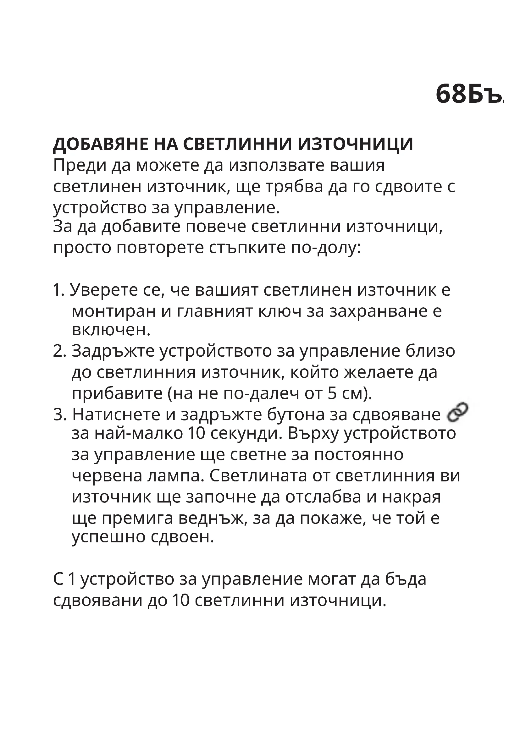 Пощенскикод702, SE-34381Елмхулт,Швеция Символът със задраскан кош за боклук означава, че артикулът следва да се изхвърли отделно от битовите отпадъци. Артикулът трябва да бъде предаден за рециклиране в съответствие с местните правила за изхвърляне на отпадъци. Като отделяте обозначените артикули от битовите отпадъци, вие спомагате за намаляването на количествата отпадъци, предавани в сметища или за изгаряне, и свеждате до минимум потенциалните отрицателни въздействия върху човешкото здраве и околната среда. Моля, обърнете се към магазин ИКЕА за повече информация.71Hrvatski DODAJIZVORSVJETLASVOJEMUREĐAJU ZA UPRAVLJANJE Prije upotrebe izvora svjetla, izvor treba prvo povezati s uređajem za upravljanje. Za dodavanje više rasvjetnih tijela, ponoviti korake ispod: