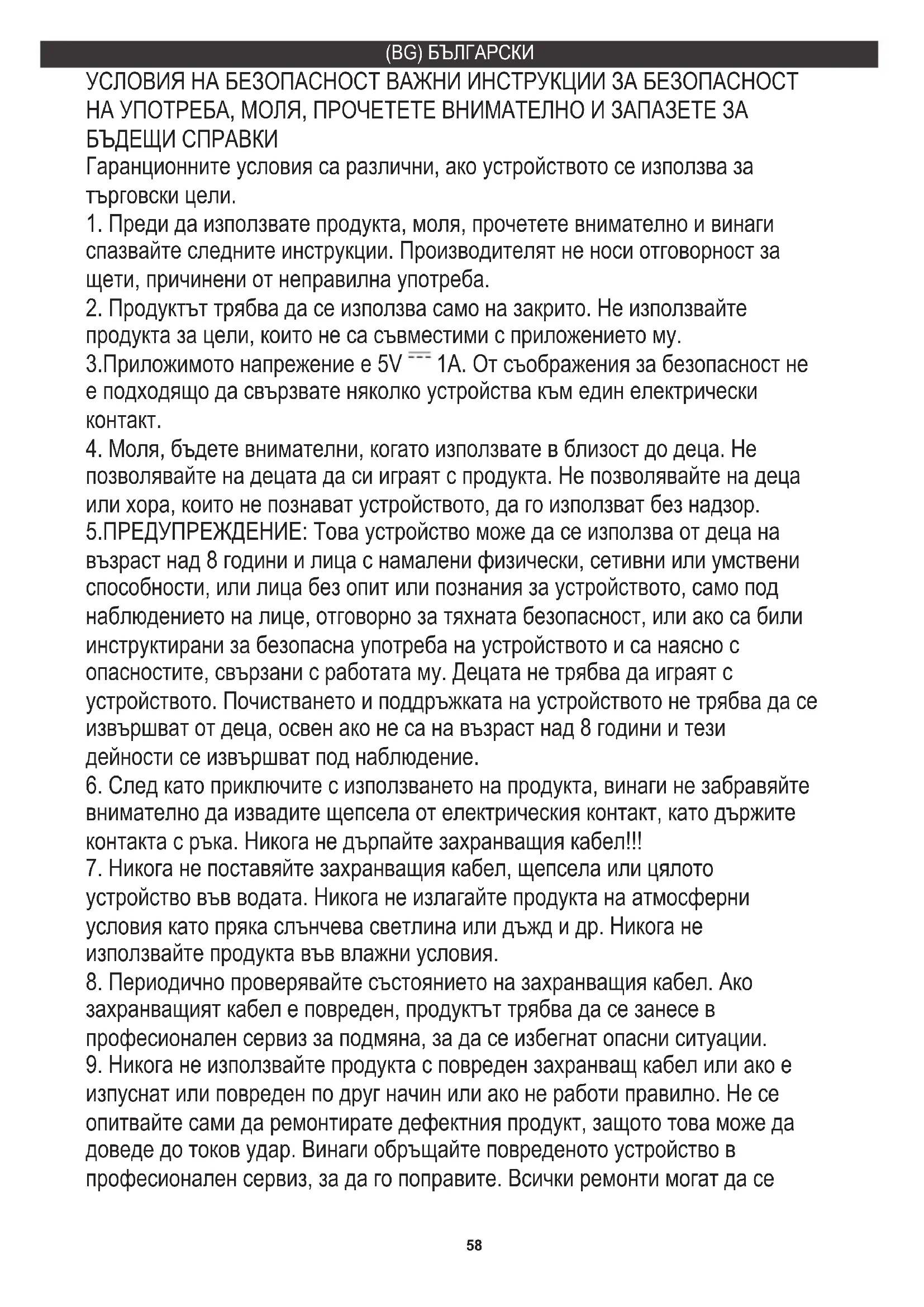 позволявайте на децата да си играят с продукта. Не позволявайте на деца или хора, които не познават устройството, да го използват без надзор. 5.ПРЕДУПРЕЖДЕНИЕ: Това устройство може да се използва от деца на възраст над 8 години и лица с намалени физически, сетивни или умствени способности, или лица без опит или познания за устройството, само под наблюдението на лице, отговорно за тяхната безопасност, или ако са били инструктирани за безопасна употреба на устройството и са наясно с опасностите, свързани с работата му. Децата не трябва да играят с устройството. Почистването и поддръжката на устройството не трябва да се извършват от деца, освен ако не са на възраст над 8 години и тези дейности се извършват под наблюдение.