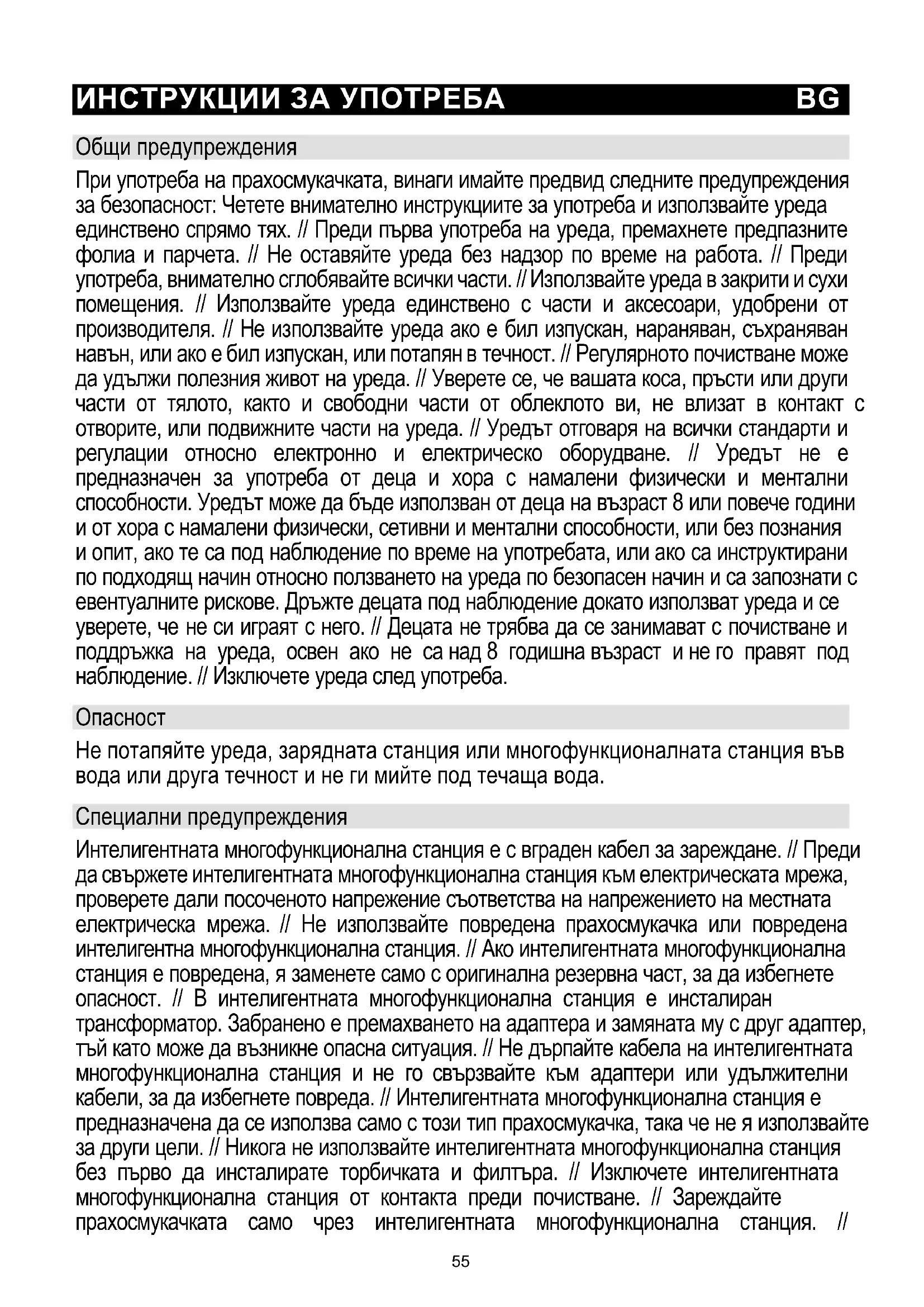 54ИНСТРУКЦИИ ЗА УПОТРЕБА BG Общи предупреждения При употреба на прахосмукачката, винаги имайте предвид следните предупреждения за безопасност: Четете внимателно инструкциите за употреба и използвайте уреда единствено спрямо тях. // Преди първа употреба на уреда, премахнете предпазните фолиа и парчета. // Не оставяйте уреда без надзор по време на работа. // Преди употреба, внимателно сглобявайте всички части. // Използвайте уреда в закрити и сухи помещения. // Използвайте уреда единствено с части и аксесоари, удобрени от производителя. // Не използвайте уреда ако е бил изпускан, нараняван, съхраняван навън, или ако е бил изпускан, или потапян в течност. // Регулярното почистване може да удължи полезния живот на уреда. // Уверете се, че вашата коса, пръсти или други части от тялото, както и свободни части от облеклото ви, не влизат в контакт с отворите, или подвижните части на уреда. // Уредът отговаря на всички стандарти и регулации относно електронно и електрическо оборудване. // Уредът не е предназначен за употреба от деца и хора с намалени физически и ментални способности. Уредът може да бъде използван от деца на възраст 8 или повече години и от хора с намалени физически, сетивни и ментални способности, или без познания и опит, ако те са под наблюдение по време на употребата, или ако са инструктирани по подходящ начин относно ползването на уреда по безопасен начин и са запознати с евентуалните рискове. Дръжте децата под наблюдение докато използват уреда и се уверете, че не си играят с него. // Децата не трябва да се занимават с почистване и поддръжка на уреда, освен ако не са над 8 годишна възраст и не го правят под наблюдение. // Изключете уреда след употреба.