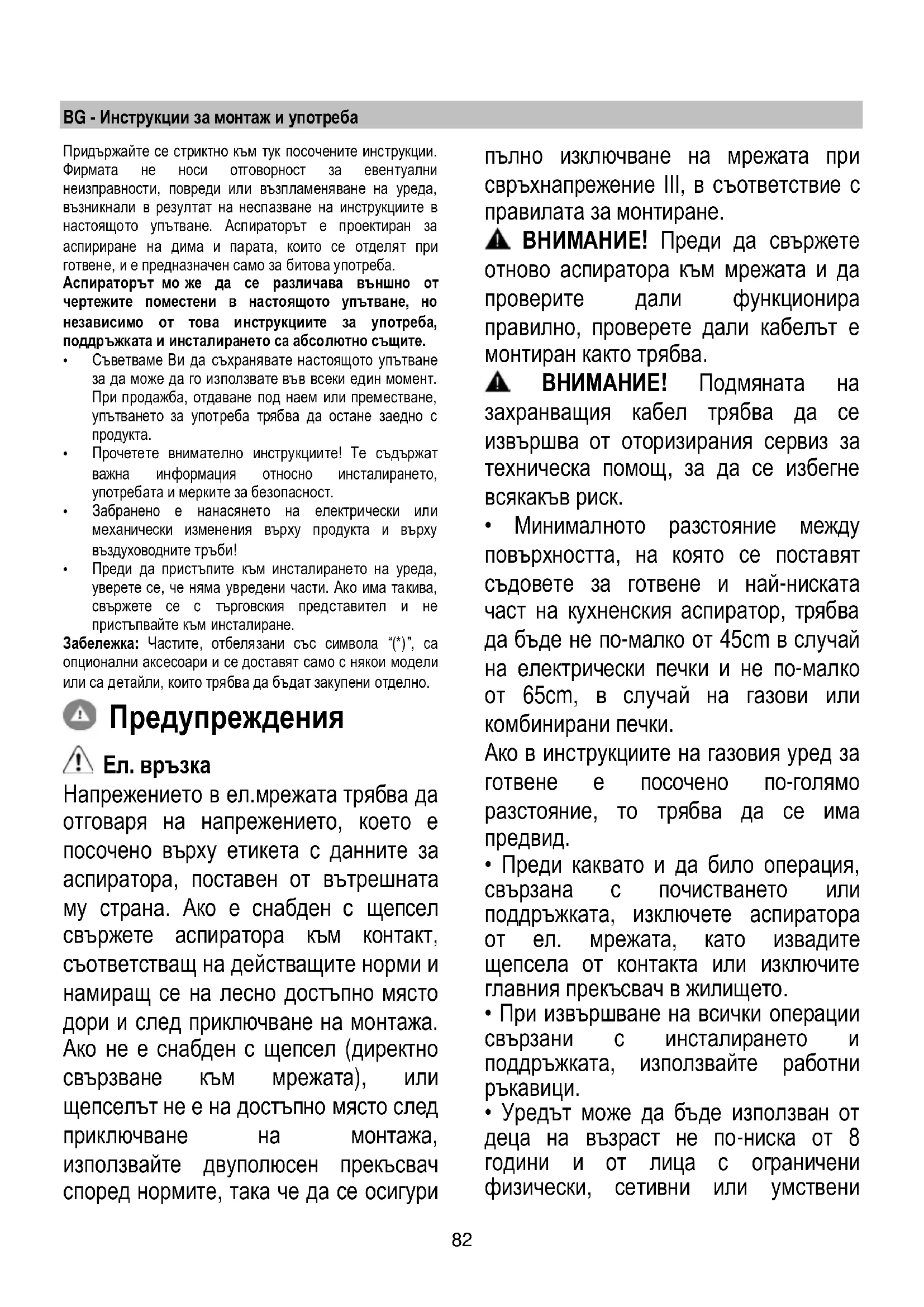 Напрежението в ел.мрежата трябва да отговаря на напрежението, което е посочено върху етикета с данните за аспиратора, поставен от вътрешната му страна. Ако е снабден с щепсел свържете аспиратора към контакт, съответстващ на действащите норми и намиращ се на лесно достъпно място дори и след приключване на монтажа. Ако не е снабден с щепсел (директно свързване към мрежата), или щепселът не е на достъпно място след приключване на монтажа, използвайте двуполюсен прекъсвач според нормите, така че да се осигури пълно изключване на мрежата при свръхнапрежение ІІІ, в съответствие с правилата за монтиране. ВНИМАНИЕ! Преди да свържете отново аспиратора към мрежата и да проверите дали функционира правилно, проверете дали кабелът е монтиран както трябва. ВНИМАНИЕ! Подмяната на захранващия кабел трябва да се извършва от оторизирания сервиз за техническа помощ, за да се избегне всякакъв риск.