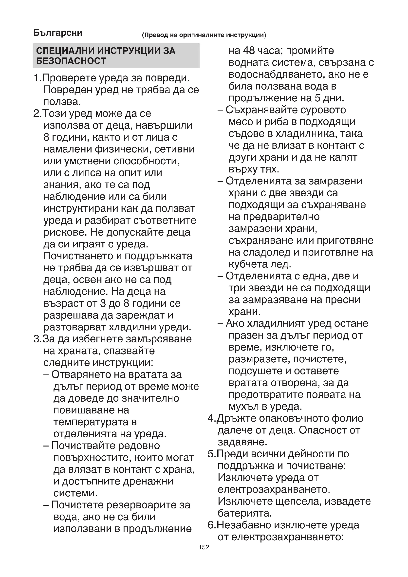2.Този уред може да се използва от деца, навършили 8 години, както и от лица с намалени физически, сетивни или умствени способности, или с липса на опит или знания, ако те са под наблюдение или са били инструктирани как да ползват уреда и разбират съответните рискове. Не допускайте деца да си играят с уреда. Почистването и поддръжката не трябва да се извършват от деца, освен ако не са под наблюдение. На деца на възраст от 3 до 8 години се разрешава да зареждат и разтоварват хладилни уреди. 3.За да избегнете замърсяване на храната, спазвайте следните инструкции: – Отварянето на вратата за дълъг период от време може да доведе до значително повишаване на температурата в отделенията на уреда. – Почиствайте редовно повърхностите, които могат да влязат в контакт с храна, и достъпните дренажни