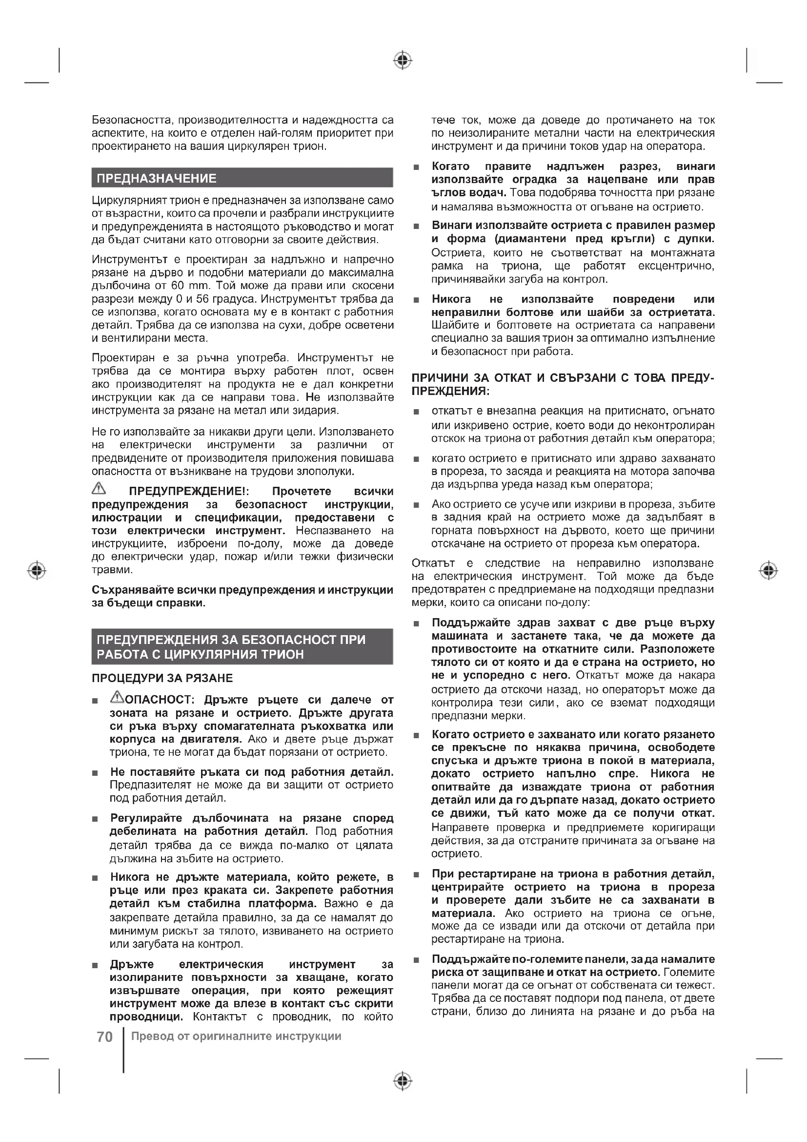 Съхранявайте всички предупреждения и инструкции за бъдещи справки. ПРЕДУПРЕЖДЕНИЯ ЗА БЕЗОПАСНОСТ ПРИ РАБОТА С ЦИРКУЛЯРНИЯ ТРИОН ПРОЦЕДУРИ ЗА РЯЗАНЕ ■ ОПАСНОСТ: Дръжте ръцете си далече от зоната на рязане и острието. Дръжте другата си ръка върху спомагателната ръкохватка или корпуса на двигателя. Ако и двете ръце държат триона, те не могат да бъдат порязани от острието. ■ Не поставяйте ръката си под работния детайл. Предпазителят не може да ви защити от острието под работния детайл. ■ Регулирайте дълбочината на рязане според дебелината на работния детайл. Под работния детайл трябва да се вижда по-малко от цялата дължина на зъбите на острието. ■ Никога не дръжте материала, който режете, в ръце или през краката си. Закрепете работния детайл към стабилна платформа. Важно е да закрепвате детайла правилно, за да се намалят до минимум рискът за тялото, извиването на острието или загубата на контрол. ■ Дръжте електрическия инструмент за изолираните повърхности за хващане, когато извършвате операция, при която режещият инструмент може да влезе в контакт със скрити проводници. Контактът с проводник, по който тече ток, може да доведе до протичането на ток по неизолираните метални части на електрическия инструмент и да причини токов удар на