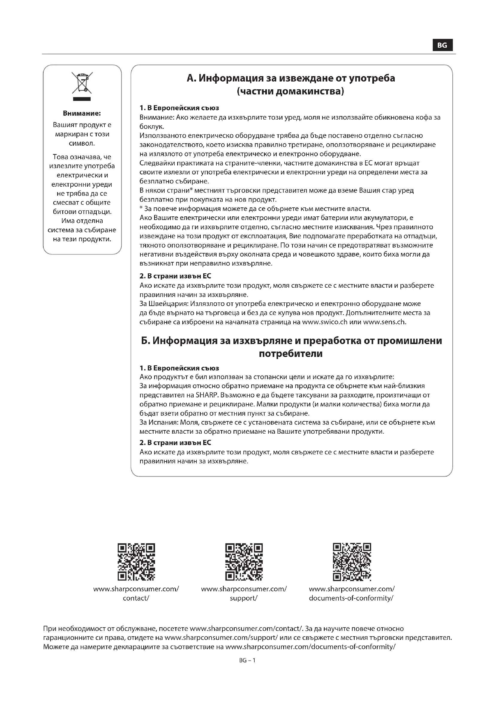 Това означава, че излезлите употреба електрически и електронни уреди не трябва да се смесват с общите битови отпадъци. Има отделна система за събиране на тези продукти. www.sharpconsumer.com/ support/ www.sharpconsumer.com/ documents-of-conformity/ www.sharpconsumer.com/ contact/ При необходимост от обслужване, посетете www.sharpconsumer.com/contact/. За да научите повече относно гаранционните си права, отидете на www.sharpconsumer.com/support/ или се свържете с местния търговски представител. Можете да намерите декларациите за съответствие на www.sharpconsumer.com/documents-of-conformity/ BGBG BG – 2 BG – 2