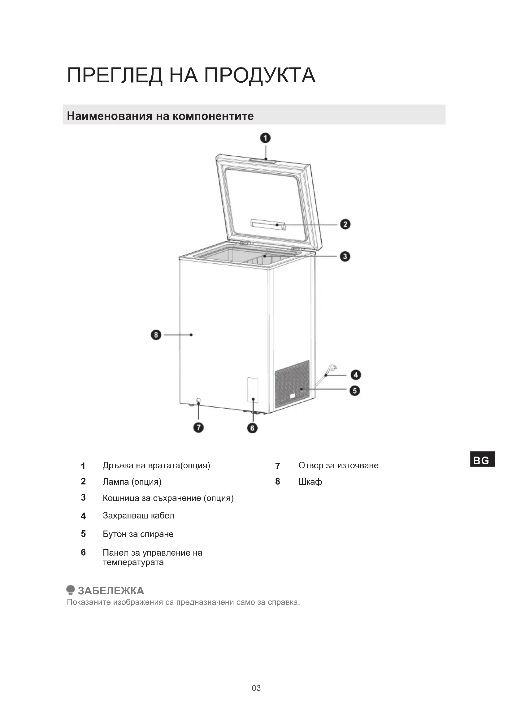 ПОЧИСТВАНЕ И ПОДДРЪЖКА Вашата фризерна ракла е проектирана за целогодишно използване и изисква минимално почистване и поддръжка. За да поддържате ефективна и без миризми работа на фризера, препоръчваме да го почиствате редовно. Размразяване Фризерът може да се размразява ръчно.