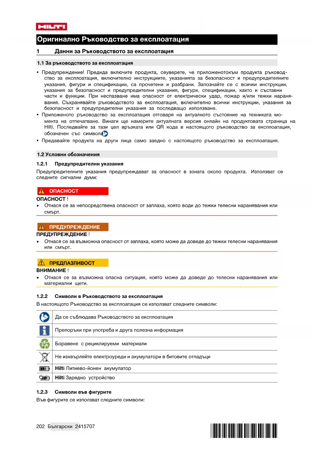 В настоящото Ръководство за експлоатация се използват следните символи: Да се съблюдава Ръководството за експлоатация Препоръки при употреба и друга полезна информация Боравене с рециклируеми материали Не изхвърляйте електроуреди и акумулатори в битовите отпадъци Hilti Литиево-йонен акумулатор Hilti Зарядно устройство