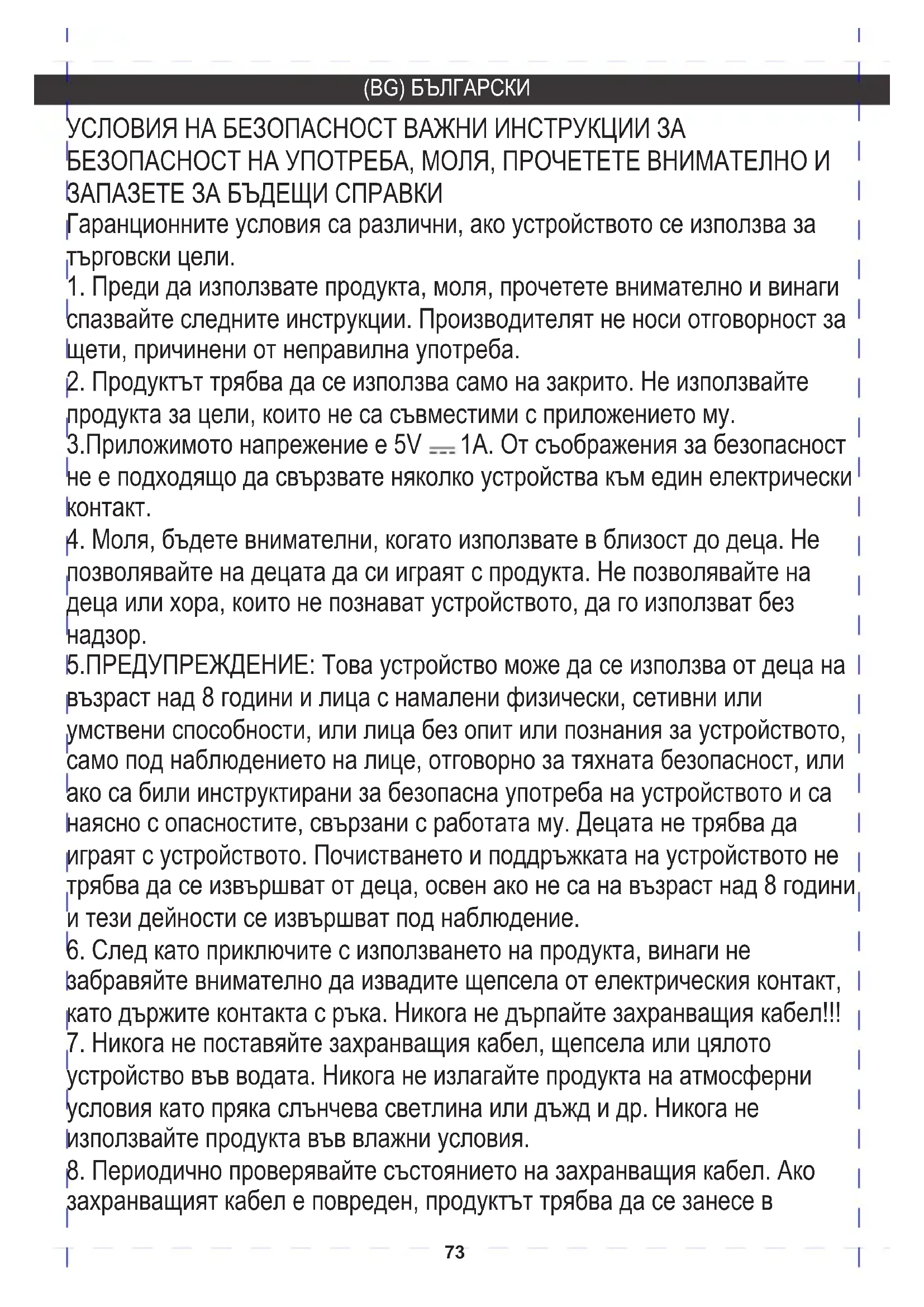 5.ПРЕДУПРЕЖДЕНИЕ: Това устройство може да се използва от деца на възраст над 8 години и лица с намалени физически, сетивни или умствени способности, или лица без опит или познания за устройството, само под наблюдението на лице, отговорно за тяхната безопасност, или ако са били инструктирани за безопасна употреба на устройството и са наясно с опасностите, свързани с работата му. Децата не трябва да играят с устройството. Почистването и поддръжката на устройството не трябва да се извършват от деца, освен ако не са на възраст над 8 години и тези дейности се извършват под наблюдение.