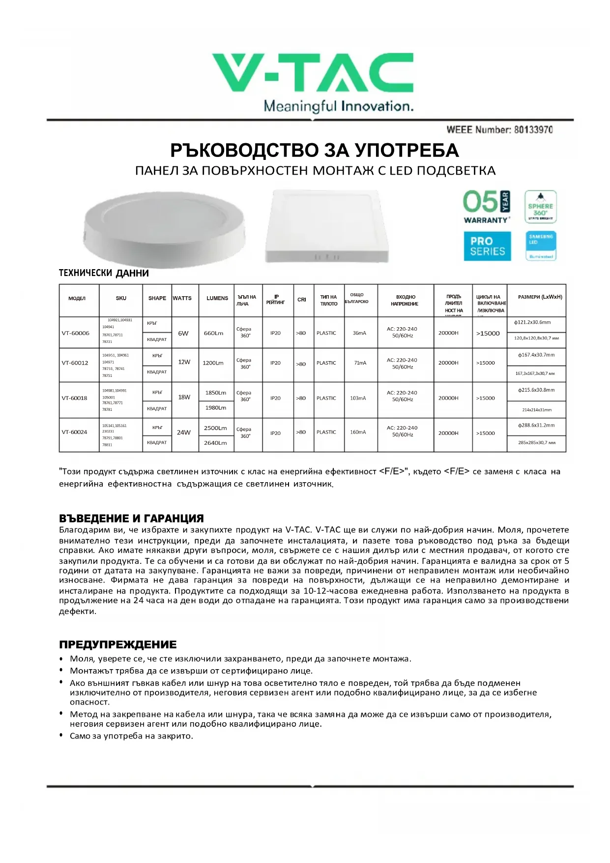 ВЪВЕДЕНИЕ И ГАРАНЦИЯ Благодарим ви, че избрахте и закупихте продукт на V-TAC. V-TAC ще ви служи по най-добрия начин. Моля, прочетете внимателно тези инструкции, преди да започнете инсталацията, и пазете това ръководство под ръка за бъдещи справки. Ако имате някакви други въпроси, моля, свържете се с нашия дилър или с местния продавач, от когото сте закупили продукта. Те са обучени и са готови да ви обслужат по най-добрия начин. Гаранцията е валидна за срок от 5 години от датата на закупуване. Гаранцията не важи за повреди, причинени от неправилен монтаж или необичайно износване. Фирмата не дава гаранция за повреди на повърхности, дължащи се на неправилно демонтиране и инсталиране на продукта. Продуктите са подходящи за 10-12-часова ежедневна работа. Използването на продукта в продължение на 24 часа на ден води до отпадане на гаранцията. Този продукт има гаранция само за производствени
