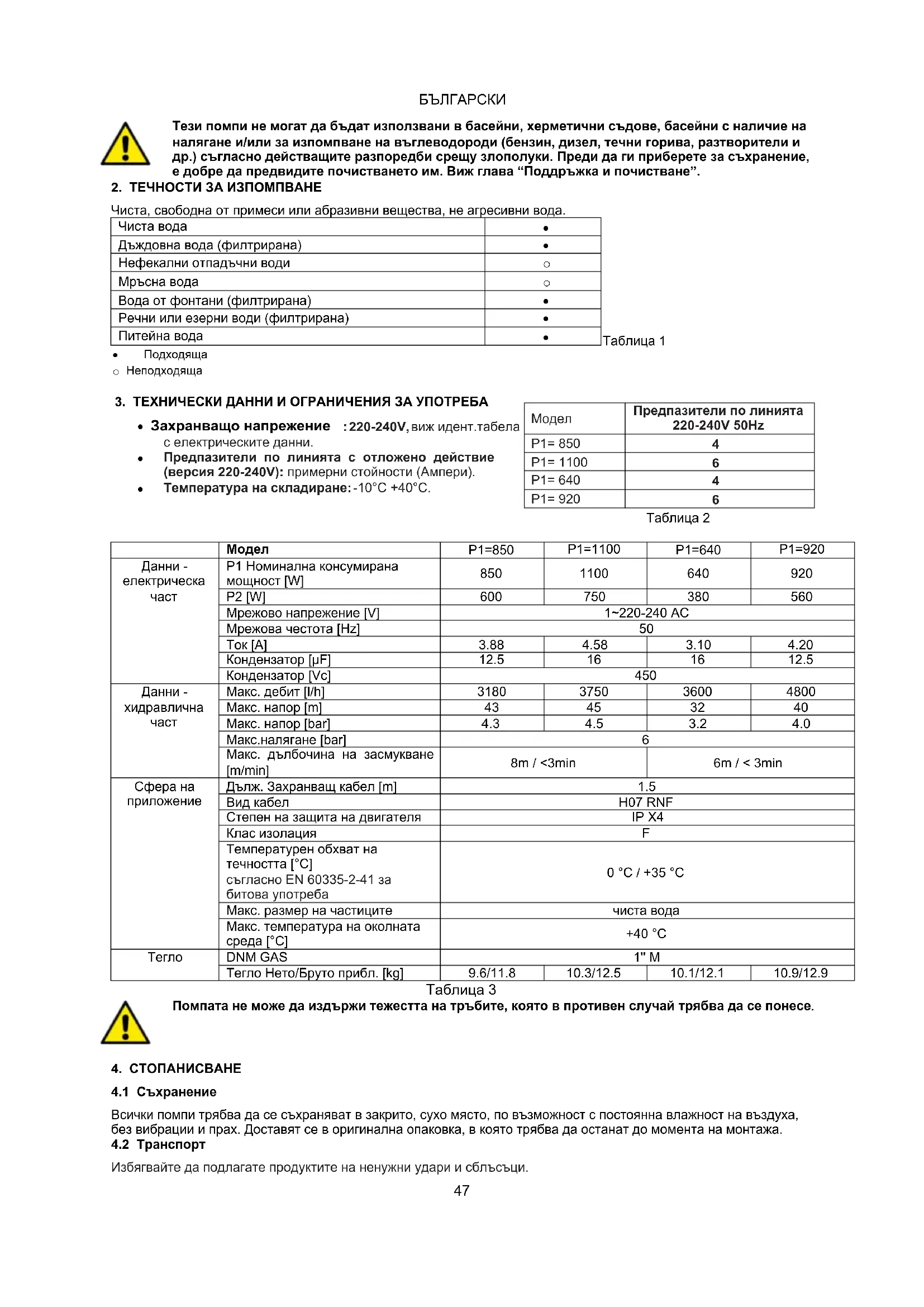 Тези помпи не могат да бъдат използвани в басейни, херметични съдове, басейни с наличие на налягане и/или за изпомпване на въглеводороди (бензин, дизел, течни горива, разтворители и др.) съгласно действащите разпоредби срещу злополуки. Преди да ги приберете за съхранение, е добре да предвидите почистването им. Виж глава “Поддръжка и почистване”.