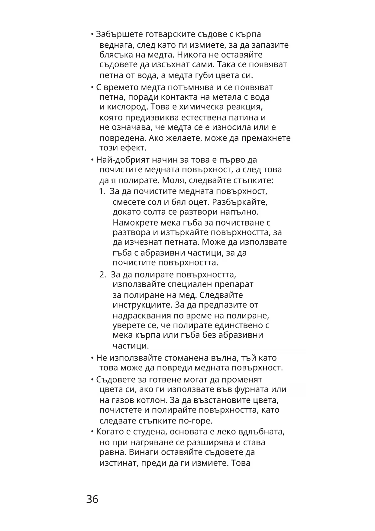 - Не използвайте стоманена вълна, тъй като това може да повреди медната повърхност.