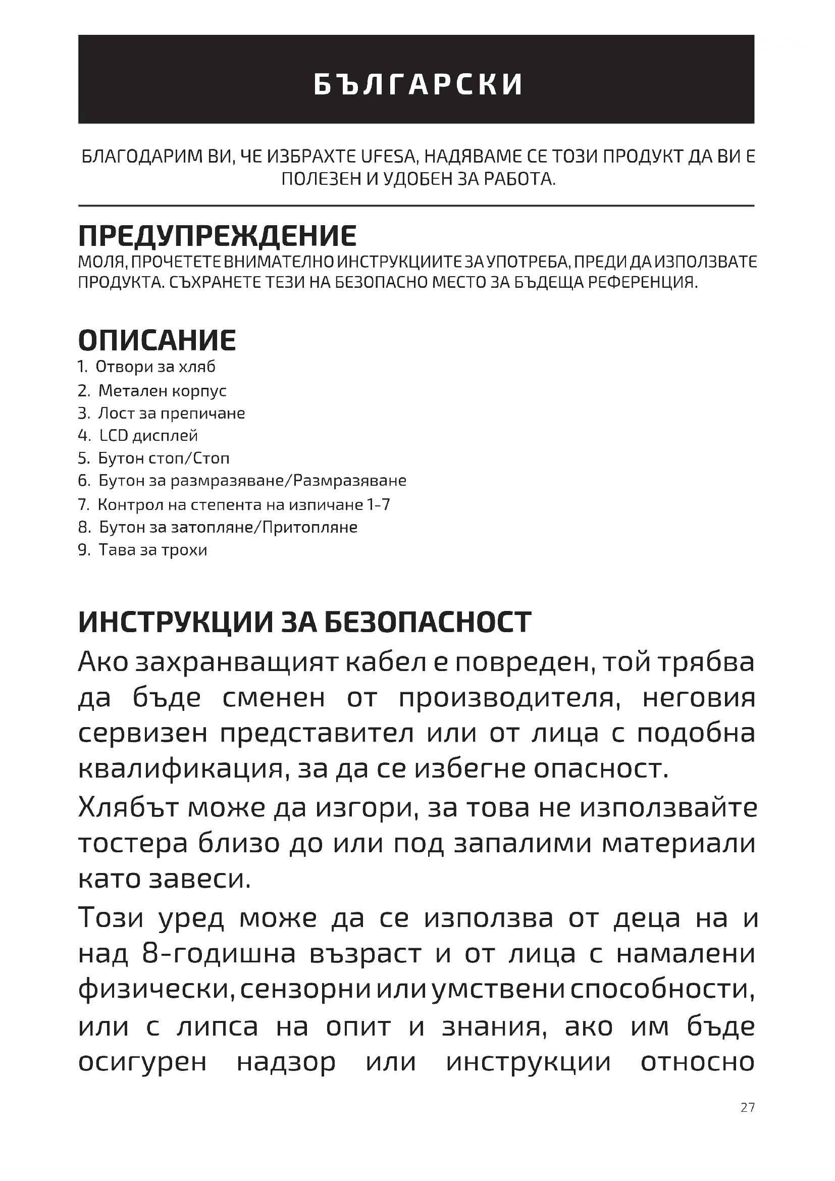 ИНСТРУКЦИИ ЗА БЕЗОПАСНОСТ Ако захранващият кабел е повреден, той трябва да бъде сменен от производителя, неговия сервизен представител или от лица с подобна квалификация, за да се избегне опасност. Хлябът може да изгори, за това не използвайте тостера близо до или под запалими материали като завеси. Този уред може да се използва от деца на и над 8-годишна възраст и от лица с намалени физически, сензорни или умствени способности, или с липса на опит и знания, ако им бъде осигурен надзор или инструкции относно28 използването на уреда по безопасен начин и ако разбират свързаните с това опасности. Не позволявайте на деца да си играят с уреда. Почистването и поддръжката не трябва да се извършват от деца, освен ако не са над 8 години и са под надзор. Пазете уреда и неговия кабел извън досега на деца, ненавършили 8 години. Този уред е предназначен за употреба за битови нужди. Той не е предназначен за употреба в следните случаи: - Кухни за персонала в магазини, офиси и други работни места. - селскостопански помещения. - oт клиенти в хотели, мотели и други видове заведения от жилищен тип. - Заведения, предлагащи нощувки и закуски. - Следвайте инструкциите в раздела за поддръжка и почистване на настоящото ръководство за почистване. - Не потапяйте уреда във вода или каквато и да е друга течност. Уредите не са предвидени да работят с външен таймер или отделна система за дистанционен контрол. При почистване следвайте инструкциите в раздела за поддръжка и почистване на това ръководство. Този уред е предназначен за използване на максимална надморска височина от 2000 м над морското равнище.29 ВАЖНИ ПРЕДУПРЕЖДЕНИЯ Всяка неправилна употреба или неправилно боравене с уреда води до анулиране на гаранцията. Преди да включите уреда, проверете дали мрежовото напрежение е същото като посоченото на етикета на уреда. Кабелът за свързване към мрежата не трябва да се заплита или увива около уреда по време на употреба. Не използвайте устройството и не го включвайте и изключвайте от захранващата мрежа с мокри ръце и/или крака. Не дърпайте захранващия кабел, за да го изключите, и не го използвайте като ръкохватка. Изключете уреда незабавно от електрическата мрежа в случай на повреда и се свържете с официална служба за техническа поддръжка. За да предотвратите риск от опасност, не отваряйте уреда. Само квалифициран технически персонал от официалната служба за техническа поддръжка за съответната търговска марка може да извършва ремонт или процедури по уреда. B&B TRENDS SL. не носи отговорност за щети, нанесени на хора, животни или предмети, поради неспазване на тези предупреждения. КАК ДА ИЗПОЛЗВАТЕ УРЕДА Преди да използвате уреда за пръв път, отстранете всички опаковъчни материали и всякакви устройства за безопасност по време на транспортиране. Уверете се, че всички упоменати аксесоари са доставени и почистете тостера с влажна кърпа. Уверете се, че между тостера и стената или други уреди има достатъчно място, тъй като тостерът ще стане горещ по време на работа, и свържете уреда в електрическата мрежа чрез захранващия кабел. Преди да използвате тостера за първи път, ще трябва да пуснете процес на препичане без хляб. Натиснете надолу лостовете за препичане и на двете части на тостера, докато се заключат на място. Когато препичането приключи, лостовете за препичане автоматично и