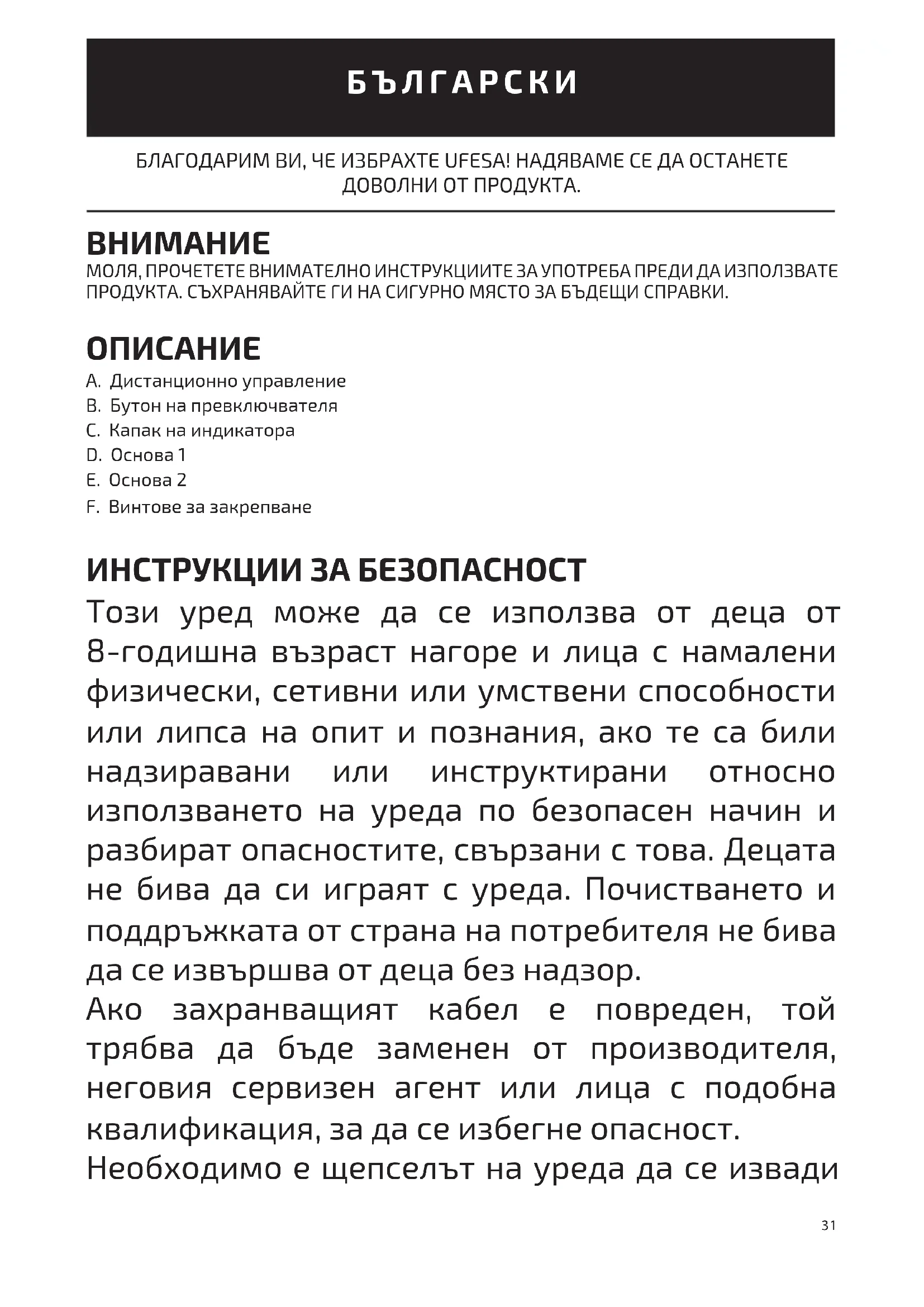 A. Дистанционно управление B. Бутон на превключвателя C. Капак на индикатора D. Основа 1 E. Основа 2 F. Винтове за закрепване ИНСТРУКЦИИ ЗА БЕЗОПАСНОСТ Този уред може да се използва от деца от 8-годишна възраст нагоре и лица с намалени физически, сетивни или умствени способности или липса на опит и познания, ако те са били надзиравани или инструктирани относно използването на уреда по безопасен начин и разбират опасностите, свързани с това. Децата не бива да си играят с уреда. Почистването и поддръжката от страна на потребителя не бива да се извършва от деца без надзор. Ако захранващият кабел е повреден, той трябва да бъде заменен от производителя, неговия сервизен агент или лица с подобна квалификация, за да се избегне опасност. Необходимо е щепселът на уреда да се извади32 от контакта преди сглобяване, разглобяване и почистване. Този уред е предназначен за използване на максимална надморска височина от 2000 м над морското равнище. ВАЖНА ИНФОРМАЦИЯ Този уред е предназначен изключително само за битова употреба – за проветряване на стаи: да не се използва за други. Всяка друга употреба следва да се счита за неуместна и опасна. Производителят не носи отговорност за щети, произтичащи от неподходяща, неправилна и безотговорна употреба и/или за ремонти, извършени от техници без необходимата квалификация. Забранено е вкарването на пръсти или други предмети през защитната решетка на вентилатора. Уредът трябва да се държи далеч от досега на деца. Уредът не бива да се ползва, ако не работи нормално или ако изглежда повреден; ако има съмнения, необходимо е да се занесе на професионален, квалифициран техник. Докато работи, уредът не бива да се мести. Когато уредът не се ползва, извадете щепсела от електрическия контакт. Уредът не бива да се докосва с мокри ръце или крака. Уредът не бива да се влачи за кабела с цел преместване. Кабелът или самият уред не бива да се дърпат с цел разединяване на щепсела от електрическия контакт. За почистване на уреда е необходимо да се следват инструкциите в раздела на упътването, посветен на почистването и поддръжката. B&B TRENDS, S.L. не носи отговорност за наранявания или щети, които могат да възникнат при хора, животни или предмети в резултат на неспазване на горепосочените предупреждения