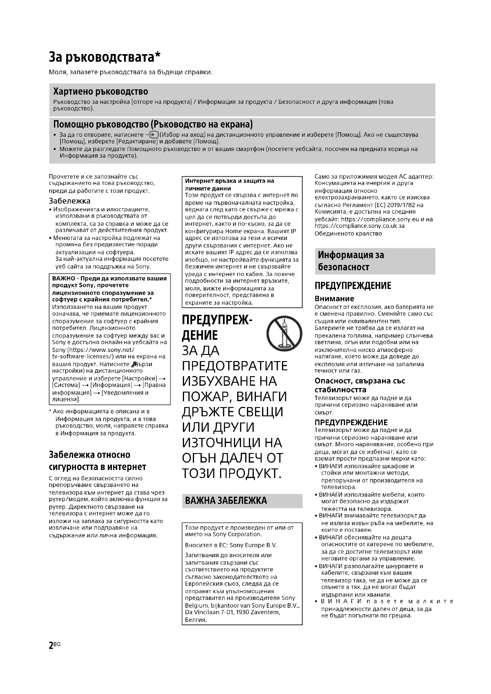 Опасност от експлозия, ако батерията не е сменена правилно. Сменяйте само със същия или еквивалентен тип.Батериите не трябва да се излагат на прекалена топлина, например слънчева светлина, огън или подобни или на изключително ниско атмосферно налягане, което може да доведе до експлозия или изтичане на запалима течност или газ. Опасност, свързана със стабилността Телевизорът може да падне и да причини сериозно нараняване или смърт. ПРЕДУПРЕЖДЕНИЕ Телевизорът може да падне и да причини сериозно нараняване или смърт. Много наранявания, особено при деца, могат да се избегнат, като се вземат прости предпазни мерки като:• ВИНАГИ използвайте шкафове и стойки или монтажни методи, препоръчани от производителя на телевизора.• ВИНАГИ използвайте мебели, които могат безопасно да издържат тежестта на телевизора.• ВИНАГИ внимавайте телевизорът да не излиза извън ръба на мебелите, на които е поставен.• ВИНАГИ обяснявайте на децата опасностите от катерене по мебелите, за да се достигне телевизорът или неговите органи за управление.• ВИНАГИ разполагайте шнуровете и кабелите, свързани към вашия телевизор така, че да не може да се спънете в тях, да не могат бъдат издърпани или хванати.•ВИНАГИ пазете малките принадлежности далеч от деца, за да не бъдат погълнати по грешка. За ръководствата* Моля, запазете ръководствата за бъдещи справки. Хартиено ръководство Ръководство за настройка (отгоре на продукта) / Информация за продукта / Безопасност и друга информация (това ръководство). Помощно ръководство (Ръководство на екрана)