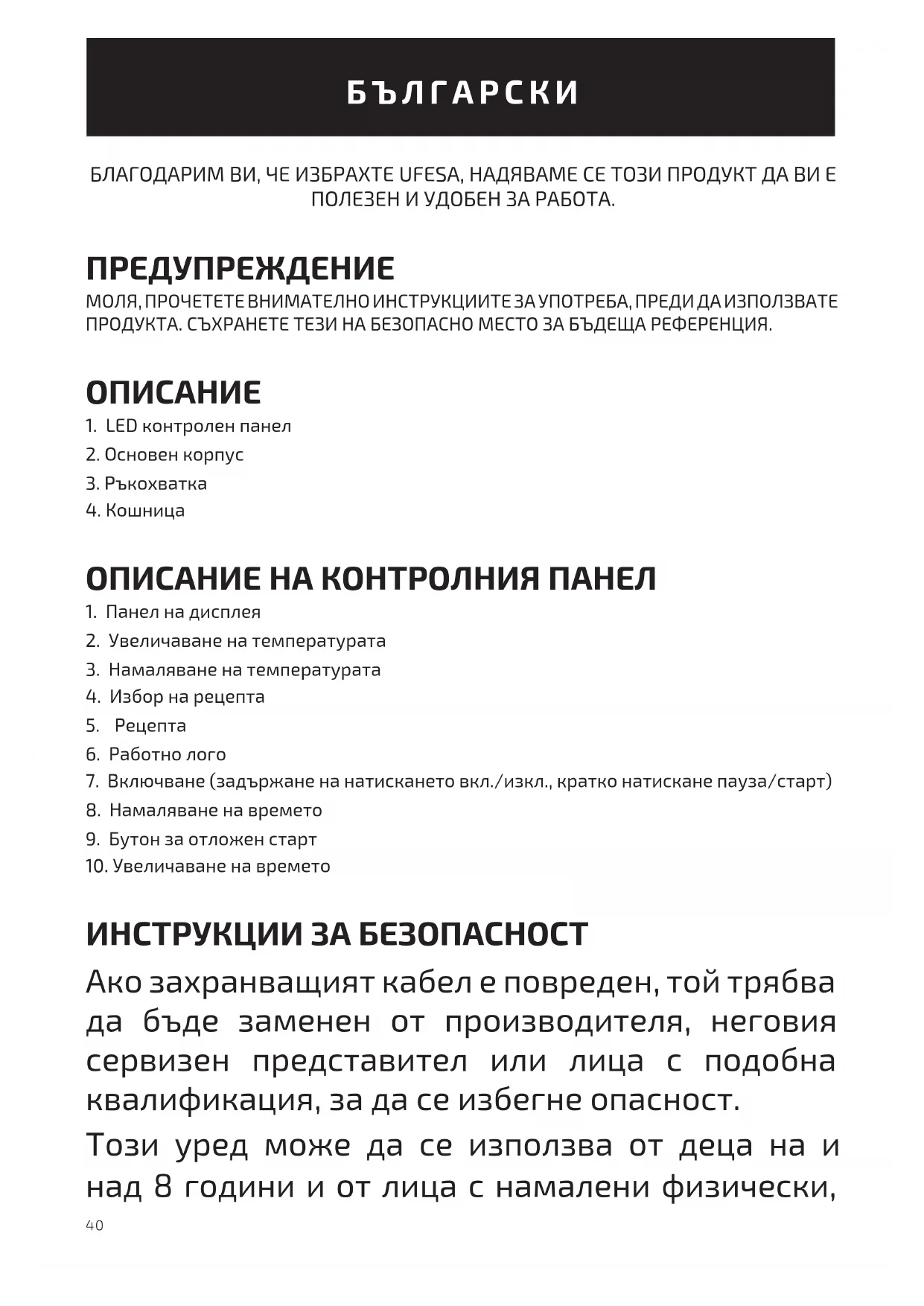ИНСТРУКЦИИ ЗА БЕЗОПАСНОСТ Ако захранващият кабел е повреден, той трябва да бъде заменен от производителя, неговия сервизен представител или лица с подобна квалификация, за да се избегне опасност. Този уред може да се използва от деца на и над 8 години и от лица с намалени физически,41 сензорни или умствени способности или с липса на опит и знания, ако им е осигурен надзор или инструкции относно използването на уреда по безопасен начин и ако разбират свързаните с това опасности. Не позволявайте на деца да си играят с уреда. Почистването и поддръжката не трябва да се извършват от деца, освен ако не са над 8 години и са под надзор. Пазете уреда и неговия кабел извън досега на деца, ненавършили 8 години. Уредите не са предвидени да работят с външен таймер или самостоятелна система за дистанционен контрол. Изключете уреда, когато не се ползва и преди да го почистите. Оставете го да се охлади преди да го сглобите, разглобите или почистите. Не потапяйте уреда във вода или друга течност. Този уред е предназначен за използване на максимална надморска височина от 2000 м над морското равнище. ВАЖНИ ПРЕДУПРЕЖДЕНИЯ Уредът е предназначен само за домашно ползване и в никакъв случай не трябва да се използва в търговска или промишлена среда. Всяка неправилна употреба или неправилно боравене с уреда ще направи гаранцията му невалидна. Преди да включите уреда, проверете дали мрежовото напрежение е същото като посоченото на етикета на уреда. Поставете уреда на равна, гладка повърхност Кабелът за свързване към мрежата не трябва да се заплита или увива около уреда по време на употреба.42 Не използвайте устройството и не го включвайте и изключвайте от захранващата мрежа с мокри ръце и/или крака. Не дърпайте захранващия кабел, за да го изключите или за да го използвате като ръкохватка ВАЖНО. Когато работите с този уред за готвене с горещ въздух, оставете поне десет сантиметра свободно пространство от всички страни на фурната, за да осигурите адекватна циркулация на въздуха. НЕ поставяйте Вашия уред за готвене с горещ въздух под шкафове, щори или завеси. Риск от прегряване / пожар. Не покривайте никоя част на еър фрайъра с кърпа или подобен материал, това ще доведе до прегряване. Риск от пожар. Това е УРЕД ЗА ГОТВЕНЕ С ГОРЕЩ ВЪЗДУХ. За готвене се изисква много малко мазнина. Не пълнете тенджерата с олио или мазнина, тъй като това може да причини