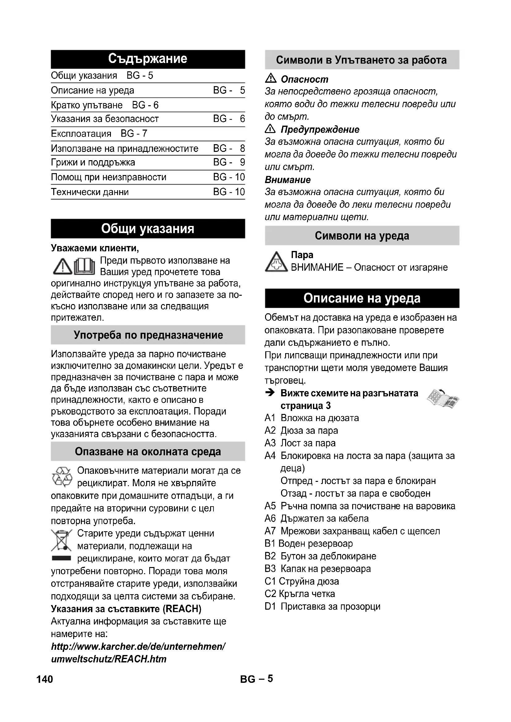 Общи указания BG - 5 Описание на уреда BG - 5 Кратко упътване BG - 6 Указания за безопасност BG - 6 Експлоатация BG - 7 Използване на принадлежностите BG - 8 Грижи и поддръжка BG - 9 Помощ при неизправности BG - 10 Технически данни BG - 10 Общи указания Употреба по предназначение Опазване на околната среда Символи в Упътването за работа Символи на уреда Описание на уреда A1 Вложка на дюзата A2 Дюза за пара A3 Лост за пара A4 Блокировка на лоста за пара (защита за