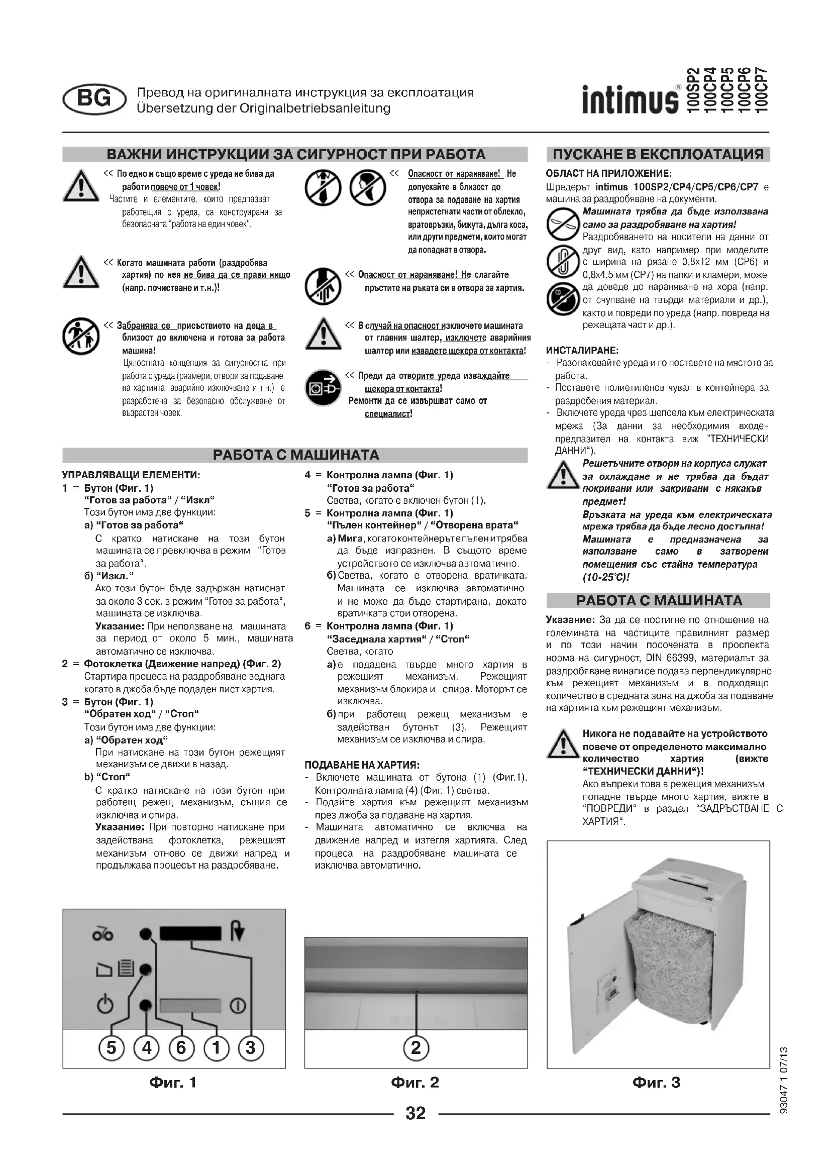 Csatlakoztatásifeszültség: 230V/50Hz 240V/50Hz 120V/60Hz 100V/50/60HzElôtétbiztosíték:230V+240V/50Hz: 10 A (lomha)120V+100V/50/60Hz: 20 A (lomha)Munkaszélesség: 260 mmZajszint: kb. 54dB(A)Teljesítmény:100SP2, 100CP4-CP6: 1,1 kW100CP7: 1,5 kWMéretek(SzéxMéxMa): 490x430x870 mmSúly: kb. 43 kgAGÉPMEGSEMMISÍTÉSE:Ha lejárt a gép élettartama, akkor a gépet mindig környezetbarát módon semmisítse meg. A gép vagy a csomagolás semelyik részét ne tegye a háztartási szemét közé.Az eredeti üzemeltetési utasítás fordításaÜbersetzung der OriginalbetriebsanleitungAFELFOGÓZSÁKÜRÍTÉSE(3.ábra):Ha a gyűjtőzacskó megtelt, a gép kikapcsol. A „Tartály tele“ / „Ajtó nyitva“ (5) kontrollkijelző (1. ábra) villog. A leállított vágómechanizmus jelzéséhez egyidejűleg kigyúl a „Papírtorlódás” / „Stop” (6) kontrollkijelzés. A felfogó zsákot a következőképpen ürítse ki: - Nyissa ki az ajtót, és húzza ki a tolókeretet a felfogó zsákkal együtt.- Vegye ki a teli zsákot, és a tartalmát a környe-zetvédelmi előírásoknak megfelelően távolítsa el. - Fűzze be az üres zsákot alulról a tolókereten keresztül és hajtsa ki a zsák peremét kb. 10 cm-rel a keret fölött kifelé. - Tolja be a tolókeretet a felfogó zsákkal együtt, és zárja az ajtót. Az ellenőrző kijelző (5) kialszik (1. ábra).- Nyomja meg röviden a „Hátramenet” / „Stop” (3) gombot. A vágómechanizmus felaprítja az adagolóban található maradékot és azt követően kikapcsol. A kontrollkijelzés (6) kialszik. Most már folytatni lehet az aprítást. Tudnivaló: A gép csak akkor jár, ha az ajtó zárva van! KEZELÉSВАЖНИ ИНСТРУКЦИИ ЗА СИГУРНОСТ ПРИ РАБОТА << Опасност от нараняване! Не допускайте в близост до отвора за подаване на хартия непристегнати части от облекло, вратовръзки, бижута, дълга коса, или други предмети, които могат да попаднат в отвора.<< Опасност от нараняване! Не слагайте пръстите на ръката си в отвора за хартия.<< В случай на опасност изключете машината от главния шалтер, изключете аварийния шалтер или извадете щекера от контакта!<< Преди да отворите уреда изваждайте щекера от контакта! Ремонти да се извършват само от специалист!<< По едно и също време с уреда не бива да работи повече от 1 човек! Частите и елементите, които предпазватработещия с уреда, са конструирани забезопасната“работанаединчовек“.<< Когато машината работи (раздробява хартия) по нея не бива да се прави нищо (напр. почистване и т.н.)!<< Забранява се присъствието на деца в близост до включена и готова за работа Цялостната концепция за сигурността при работасуреда(размери,отворизаподаване на хартията, аварийно изключване и т.н.) е разработена за безопасно обслужване отвъзрастенчовек.ОБЛАСТ НА ПРИЛОЖЕНИЕ: Шредерът intimus 100SP2/CP4/CP5/CP6/CP7 е машиназараздробяваненадокументи. Машината трябва да бъде използвана само за раздробяване на хартия! Раздробяването на носители на данни от друг вид, като например при моделите с ширина на рязане 0,8x12 мм (CP6) и 0,8x4,5мм(CP7)напапкиикламери,може да доведе до нараняване на хора (напр. от счупване на твърди материали и др.), кактоиповредипоуреда(напр.повреданарежещатачастидр.).ИНСТАЛИРАНЕ:- Разопаковайтеуредаигопоставетенамястотозаработа. - Поставете полиетиленов чувал в контейнера за раздробенияматериал.- Включетеуредачрезщепселакъмелектрическата мрежа (За данни за необходимия входен предпазител на контакта виж ”ТЕХНИЧЕСКИ ДАННИ“).Решетъчните отвори на корпуса служат за охлаждане и не трябва да бъдат покривани или закривани с някакъв предмет!Връзката на уреда към електрическата мрежа трябва да бъде лесно достъпна!Машината е предназначена за използване само в затворени помещения със стайна температура (10-25°C)!УПРАВЛЯВАЩИ ЕЛЕМЕНТИ:1 = Бутон (Фиг. 1) “Готов за работа“ / “Изкл“ Тозибутонимадвефункции: a) “Готов за работа“ С кратко натискане на този бутон машинатасепревключваврежим “Готовзаработа“. б) “Изкл.“ Ако този бутон бъде задържан натиснат заоколо3сек.врежим“Готовзаработа“,машинатасеизключва.Указание:При