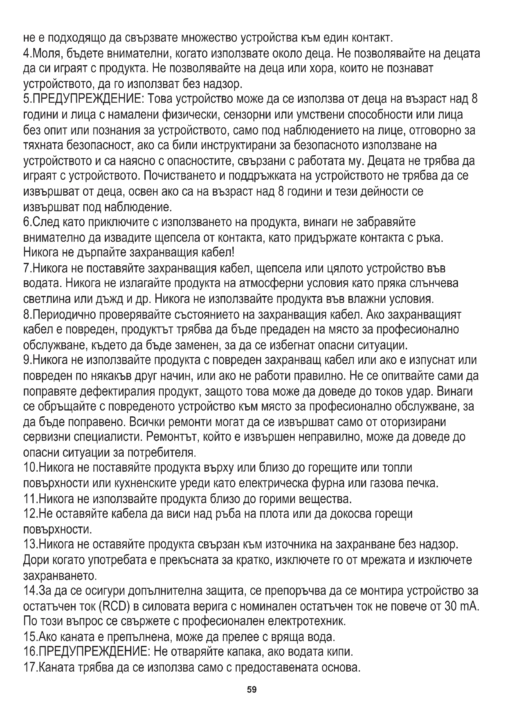 1.Преди да използвате продукта, моля, прочетете внимателно и винаги спазвайте следните инструкции. Производителят не носи отговорност за щети, причинени от злоупотреба. (BG) БЪЛГАРСКИ59 не е подходящо да свързвате множество устройства към един контакт. 15.Ако каната е препълнена, може да прелее с вряща вода. 4.Моля, бъдете внимателни, когато използвате около деца. Не позволявайте на децата да си играят с продукта. Не позволявайте на деца или хора, които не познават устройството, да го използват без надзор. 6.След като приключите с използването на продукта, винаги не забравяйте внимателно да извадите щепсела от контакта, като придържате контакта с ръка. Никога не дърпайте захранващия кабел! 16.ПРЕДУПРЕЖДЕНИЕ: Не отваряйте капака, ако водата кипи. 5.ПРЕДУПРЕЖДЕНИЕ: Това устройство може да се използва от деца на възраст над 8 години и лица с намалени физически, сензорни или умствени способности или лица без опит или познания за устройството, само под наблюдението на лице, отговорно за тяхната безопасност, ако са били инструктирани за безопасното използване на устройството и са наясно с опасностите, свързани с работата му. Децата не трябва да играят с устройството. Почистването и поддръжката на устройството не трябва да се извършват от деца, освен ако са на възраст над 8 години и тези дейности се извършват под наблюдение. 8.Периодично проверявайте състоянието на захранващия кабел. Ако захранващият кабел е повреден, продуктът трябва да бъде предаден на място за професионално обслужване, където да бъде заменен, за да се избегнат опасни ситуации. 11.Никога не използвайте продукта близо до горими вещества. 14.За да се осигури допълнителна защита, се препоръчва да се монтира устройство за остатъчен ток (RCD) в силовата верига с номинален остатъчен ток не повече от 30 mA. По този въпрос се свържете с професионален електротехник. 13.Никога не оставяйте продукта свързан към източника на захранване без надзор. Дори когато употребата е прекъсната за кратко, изключете го от мрежата и изключете захранването. 7.Никога не поставяйте захранващия кабел, щепсела или цялото устройство във водата. Никога не излагайте продукта на атмосферни условия като пряка слънчева светлина или дъжд и др. Никога не използвайте продукта във влажни условия. 12.Не оставяйте кабела да виси над ръба на плота или да докосва горещи повърхности. 17.Каната трябва да се използва само с предоставената основа. 10.Никога не поставяйте продукта върху или близо до горещите или топли повърхности или кухненските уреди като електрическа фурна или газова печка. 9.Никога не използвайте продукта с повреден захранващ кабел или ако е изпуснат или повреден по някакъв друг начин, или ако не работи правилно. Не се опитвайте сами да поправяте дефектиралия продукт, защото това може да доведе до токов удар. Винаги се обръщайте с повреденото устройство към място за професионално обслужване, за да бъде поправено. Всички ремонти могат да се извършват само от оторизирани сервизни специалисти. Ремонтът, който е извършен неправилно, може да доведе до опасни ситуации за потребителя.60 26.Не използвайте агресивни препарати за измиване на корпуса на чайника - те могат да повредят чайника или да премахнат маркировката. 28.Не мийте поставката на чайника директно във водата, а само избършете със суха