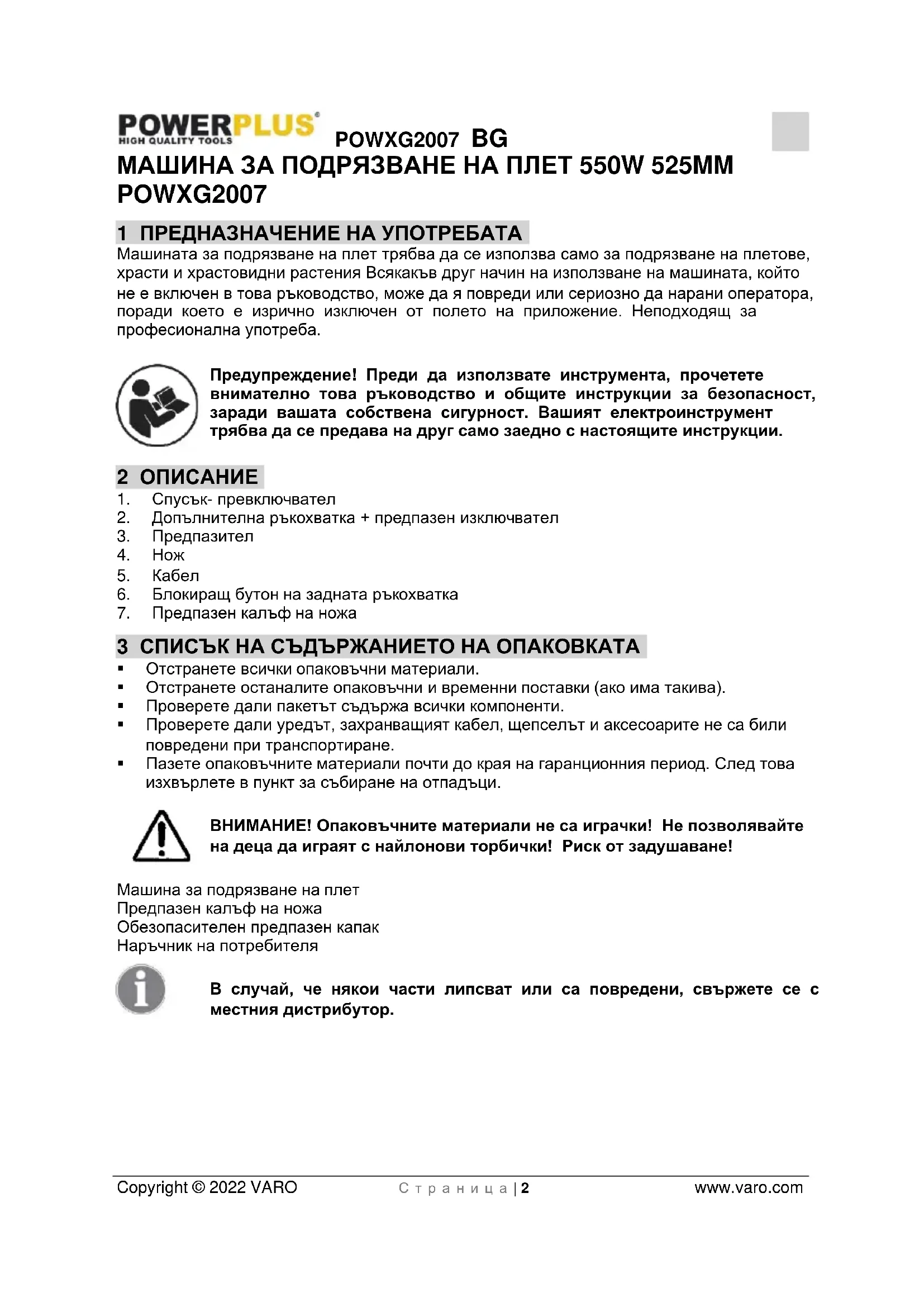 - 13 ДЕКЛАРАЦИЯ ЗА СЪОТВЕТСТВИЕ POWXG2007 BG Copyright © 2022 VARO С т р а н и ц а | 2 www.varo.com МАШИНА ЗА ПОДРЯЗВАНЕ НА ПЛЕТ 550W 525MM POWXG2007 1 ПРЕДНАЗНАЧЕНИЕ НА УПОТРЕБАТА Машината за подрязване на плет трябва да се използва само за подрязване на плетове, храсти и храстовидни растения Всякакъв друг начин на използване на машината, който не е включен в това ръководство, може да я повреди или сериозно да нарани оператора, поради което е изрично изключен от полето на приложение. Неподходящ за професионална употреба. Предупреждение! Преди да използвате инструмента, прочетете внимателно това ръководство и общите инструкции за безопасност, заради вашата собствена сигурност. Вашият електроинструмент трябва да се предава на друг само заедно с настоящите инструкции. 2 ОПИСАНИЕ p. 9