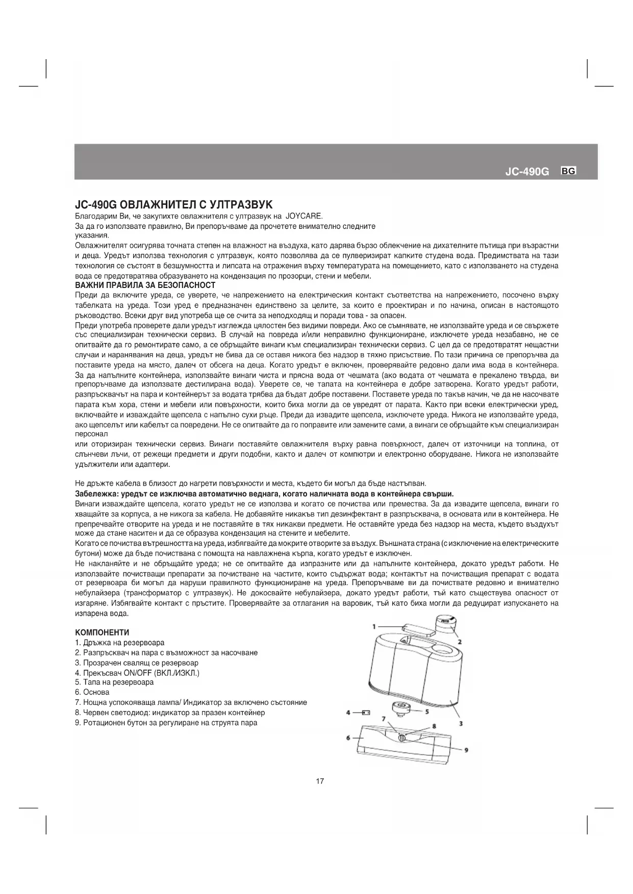 JC-490G ОВЛАЖНИТЕЛ С УЛТРАЗВУК Благодарим Ви, че закупихте овлажнителя с ултразвук на JOYCARE. За да го използвате правилно, Ви препоръчваме да прочетете внимателно следните