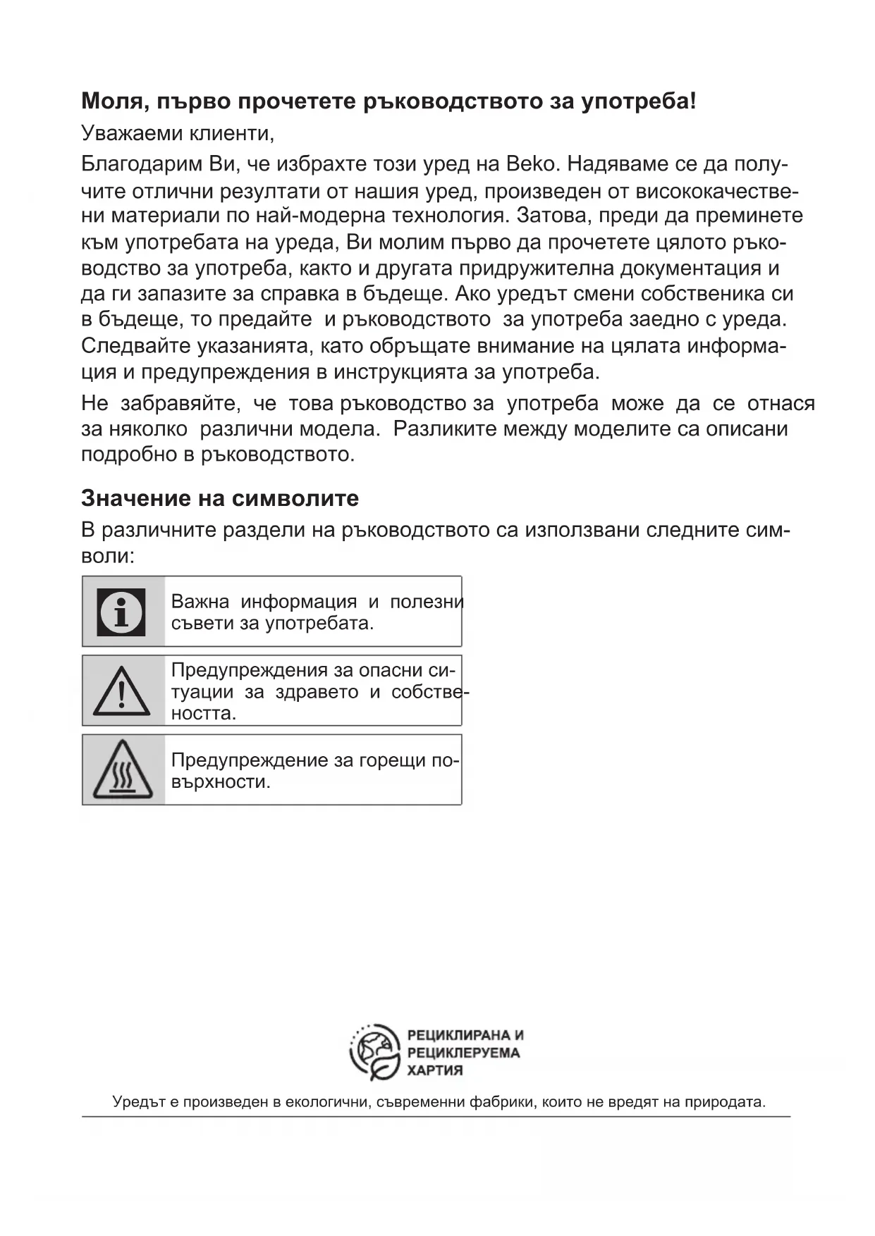 - Transportige toodet normaalasendis. Ärge jätke seda toetuma küljele ega tagaküljele.Моля, първо прочетете ръководството за употреба! Уважаеми клиенти, Благодарим Ви, че избрахте този уред на Beko. Надяваме се да полу- чите отлични резултати от нашия уред, произведен от висококачестве- ни материали по най-модерна технология. Затова, преди да преминете към употребата на уреда, Ви молим първо да прочетете цялото ръко- водство за употреба, както и другата придружителна документация и да ги запазите за справка в бъдеще. Ако уредът смени собственика си в бъдеще, то предайте и ръководството за употреба заедно с уреда. Следвайте указанията, като обръщате внимание на цялата информа- ция и предупреждения в инструкцията за употреба. Не забравяйте, че това ръководство за употреба може да се отнася за няколко различни модела. Разликите между моделите са описани подробно в ръководството. Значение на символите В различните раздели на ръководството са използвани следните сим-