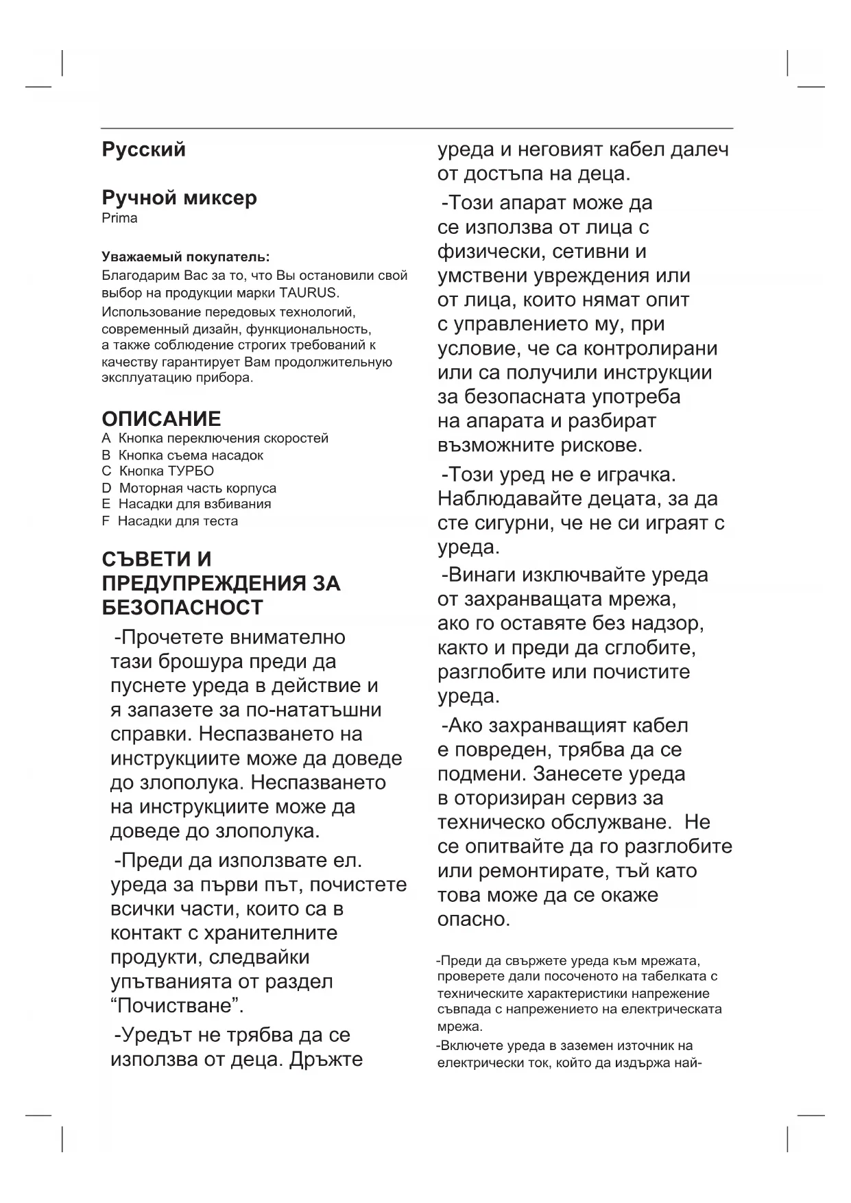 Prima (Ver III) - Ръчен блендер TAURUS - Безплатно ръководство за потребителя