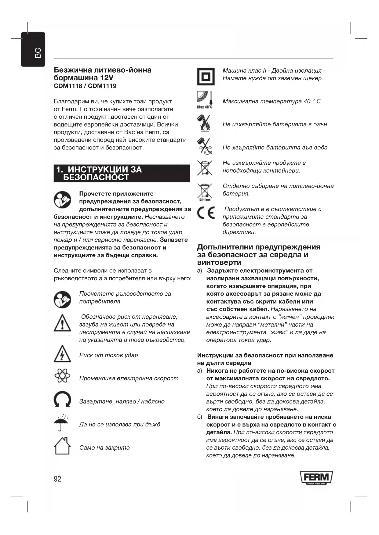 Безжична литиево-йонна бормашина 12V CDM1118 / CDM1119 Благодарим ви, че купихте този продукт от Ferm. По този начин вече разполагате с отличен продукт, доставен от един от водещите европейски доставчици. Всички продукти, доставяни от Вас на Ferm, са произведени според най-високите стандарти за безопасност и безопасност.