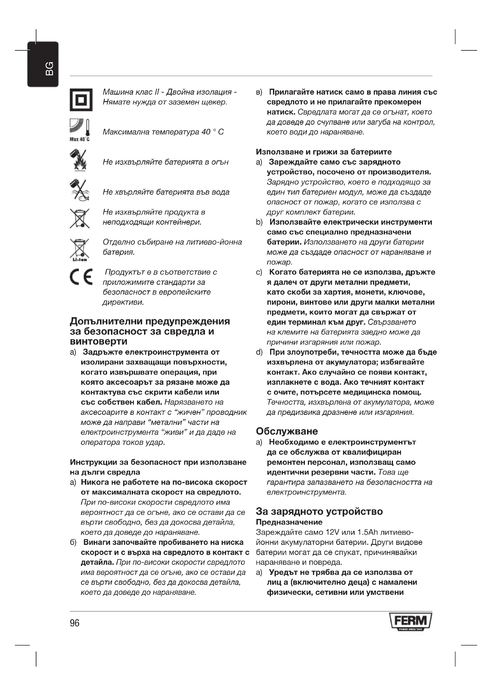 Гаранционните условия могат да бъдат намерени на отделно прикрепената гаранционна карта. ЗАОБИКАЛЯЩА СРЕДА Неизправните и / или изхвърлените електрически или електронни устройства трябва да се събират на съответните места за рециклиране. Само за страните от ЕО Не изхвърляйте електроинструментите в битови отпадъци. Съгласно Европейската насока 2012/19 / ЕС за отпадъците от електрическо и електронно оборудване и нейното прилагане в националното право електрическите инструменти, които вече не могат да се използват, трябва да се събират отделно и да се изхвърлят по екологосъобразен начин. Продуктът и ръководството за употреба подлежат на промяна. Спецификациите могат да се променят без допълнително уведомяване. Беспроводная дрель с ионно-ли- тиевой батареей 18 В CDM1120 Благодарим за приобретение продукта Ferm. Теперь у Вас есть продукт отличного качества от одного из лучших поставщиков Европы. Вся продукция компании Ferm производится в соот- ветствии с наивысшими стандартами произво- дительности и безопасности.