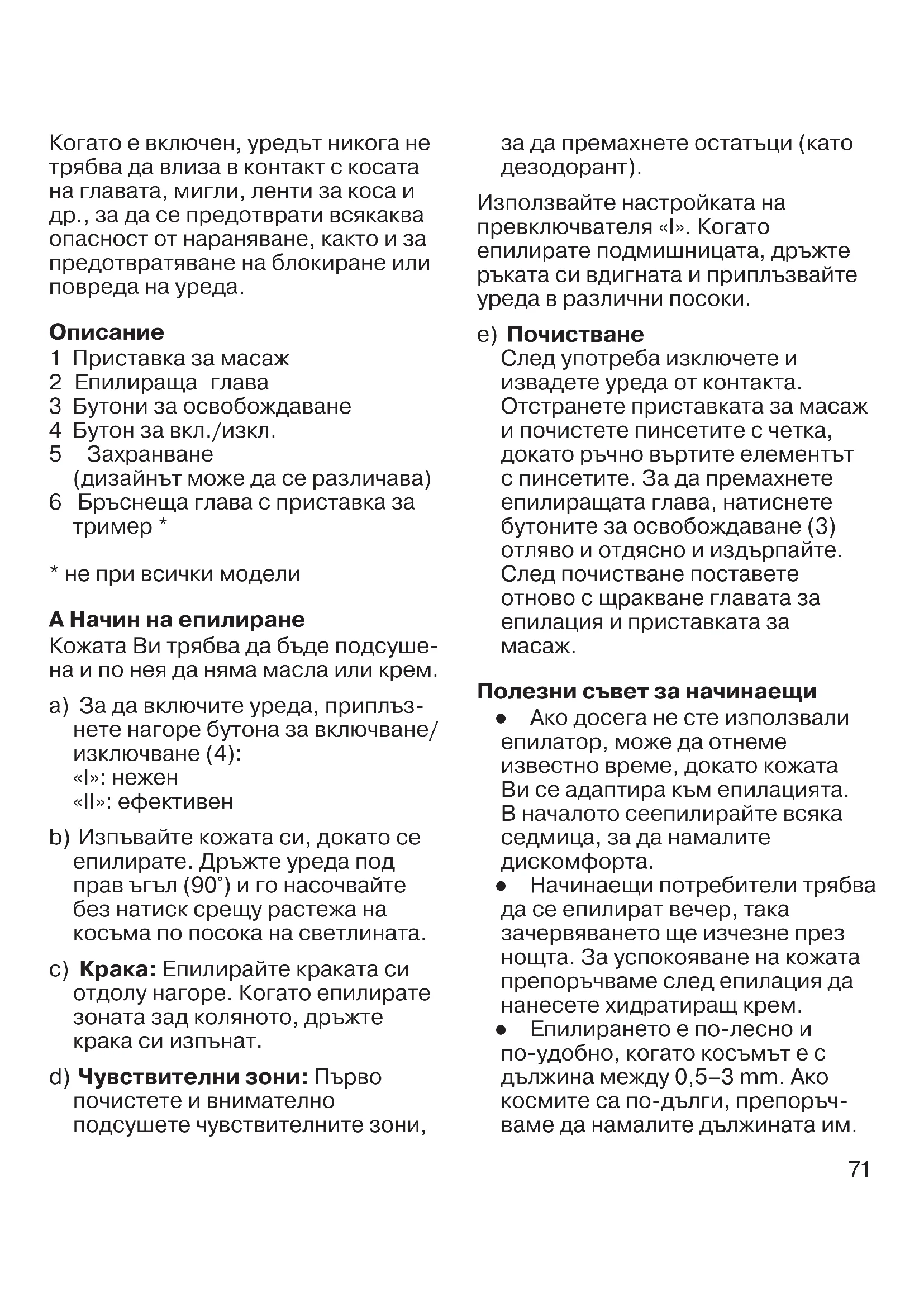 Полезни съвет за начинаещи ● Ако досега не сте използвали епилатор, може да отнеме известно време, докато кожата Ви се адаптира към епилацията. В началото сеепилирайте всяка седмица, за да намалите дискомфорта. ● Начинаещи потребители трябва да се епилират вечер, така зачервяването ще изчезне през нощта. За успокояване на кожата препоръчваме след епилация да нанесете хидратиращ крем. ● Епилирането е по-лесно и по-удобно, когато косъмът е с дължина между 0,5–3 mm. Ако космите са по-дълги, препоръч- ваме да намалите дължината им. Когато е включен, уредът никога не трябва да влиза в контакт с косата на главата, мигли, ленти за коса и др., за да се предотврати всякаква опасност от нараняване, както и за предотвратяване на блокиране или повреда на уреда.