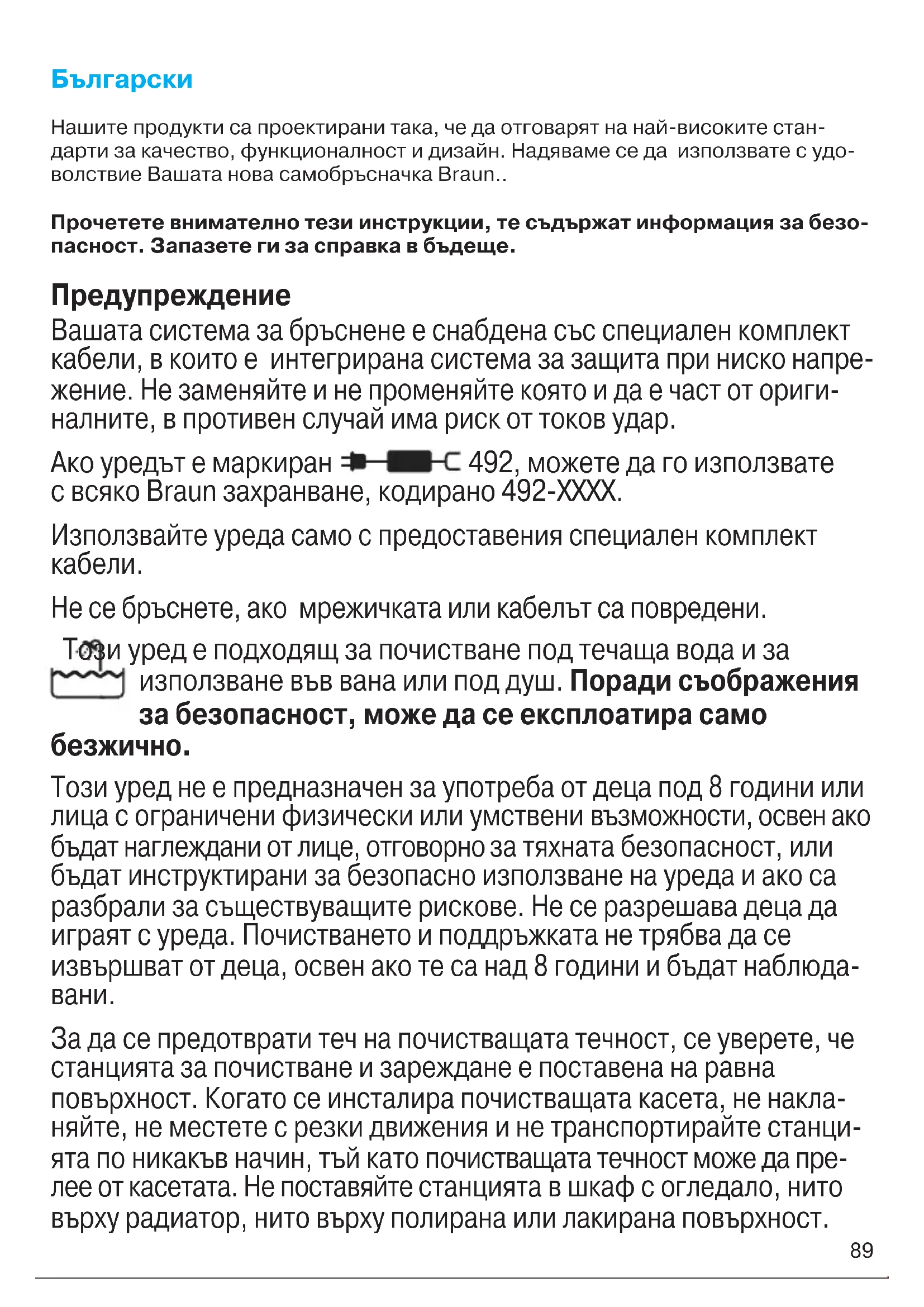 Нашите продукти са проектирани така, че да отговарят на най-високите стан- дарти за качество, функционалност и дизайн. Надяваме се да използвате с удо- волствие Вашата нова самобръсначка Braun.. Прочетете внимателно тези инструкции, те съдържат информация за безо- пасност. Запазете ги за справка в бъдеще. Предупреждение Вашата система за бръснене е снабдена със специален комплект кабели, в които е интегрирана система за защита при ниско напре- жение. Не заменяйте и не променяйте която и да е част от ориги- налните, в противен случай има риск от токов удар. Ако уредът е маркиран 492, можете да го използвате с всяко Braun захранване, кодирано 492-XXXX. Използвайте уреда само с предоставения специален комплект