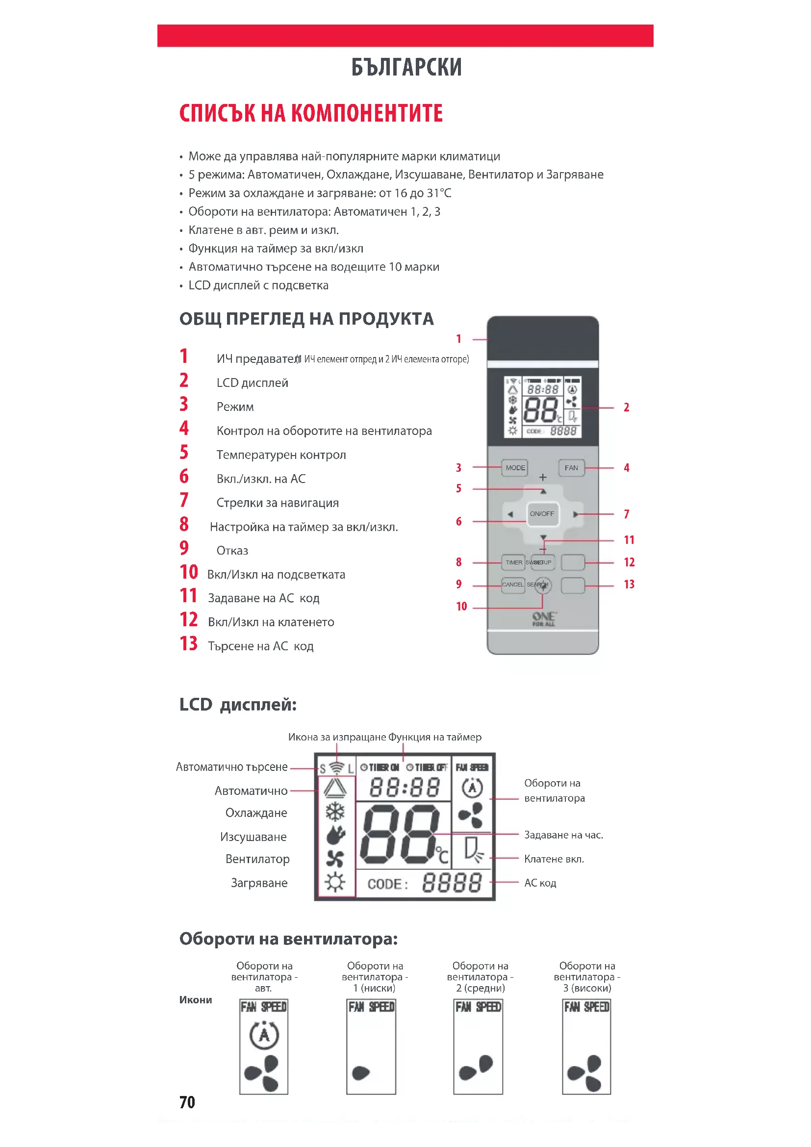 - Може да управлява най-популярните марки климатици • 5 режима: Автоматичен, Охлаждане, Изсушаване, Вентилатор и Загряване• Режим за охлаждане и загряване: от 16 до 31°C• Обороти на вентилатора: Автоматичен 1, 2, 3 • Клатене в авт. реим и изкл.• Функция на таймер за вкл/изкл• Автоматично търсене на водещите 10 марки• LCD дисплей с подсветка ОБЩ ПРЕГЛЕД НА ПРОДУКТА 1 ИЧ предавател (1 ИЧ елемент отпред и 2 ИЧ елемента отгоре) 2 LCD дисплей 3 Режим 4 Контрол на оборотите на вентилатора 5 Температурен контрол 6 Вкл./изкл. на AC 7 Стрелки за навигация 8 Настройка на таймер за вкл/изкл. 9 Отказ 10 Вкл/Изкл на подсветката 11 Задаване на AC код 12 Вкл/Изкл на клатенето 13 Търсене на AC код СПИСЪК НА КОМПОНЕНТИТЕ MODE