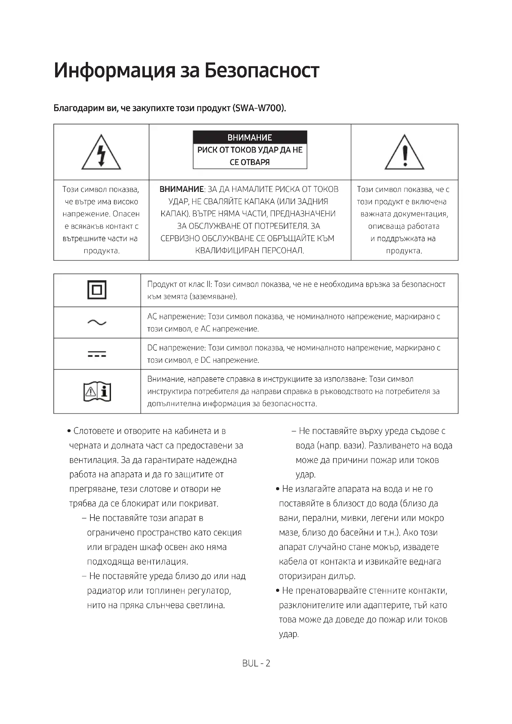 - Списъкът с модели е обект на промяна без предварително уведомяване. С настоящото Samsung Electronics декларира, че това оборудване съответства на Директива 2014/53/EС. Пълният текст на ЕС декларацията за съответствие можете да намерите на следния интернет адрес: http://www.samsung.com – отворете Поддръжка> Търсене в „Поддръжка на продуктите“ и въведете името на модела. С това оборудване може да се работи във всички държави от ЕС. Правилно третиране на изделието след края на експлоатационния му живот (Отпадъци, представляващи електрическо и електронно оборудване) (Налично в страни със системи за разделно сметосъбиране) Tози знак, поставен върху изделието, негови принадлежности или печатни материали, означава, че продуктът и принадлежностите (например зарядно устройство, слушалки, USB кабел) не бива да се изхвърлят заедно с другите битови отпадъци, когато изтече експлоатационният му живот. Отделяйте тези устройства от другите видови отпадъци и ги предавайте за рециклиране. Спазвайки това правило не излагате на опасност здравето на други хора и предпазвате околната среда от замърсяване, предизвикано от безконтролно изхвърляне на отпадъци. Освен това, подобно отговорно поведение създава възможност за повторно (екологично съобразно) използване на материалните ресурси. Домашните потребители трябва да се свържат с търговеца на дребно, от когото са закупили изделието, или със съответната местна държавна агенция, за да получат подробни инструкции къде и кога могат да занесат тези устройства за рециклиране, безопасно за околната среда. Корпоративните потребители следва да се свържат с доставчика си и да проверят условията на договора за покупка. Това изделие и неговите електронни принадлежности не бива да се сместват с другите отпадъци на търговското предприятие. За информация относно грижите на Samsung за околната среда и специфичните за продукта нормативни задължения, напр. REACH, посетете: samsung.com/uk/aboutsamsung/samsungelectronics/corporatecitizenship/data_corner.htmlCRO - 2 CRO - 3 Sigurnosne Informacije Hvala što ste kupili ovaj proizvod (SWA-W700). OPREZ
