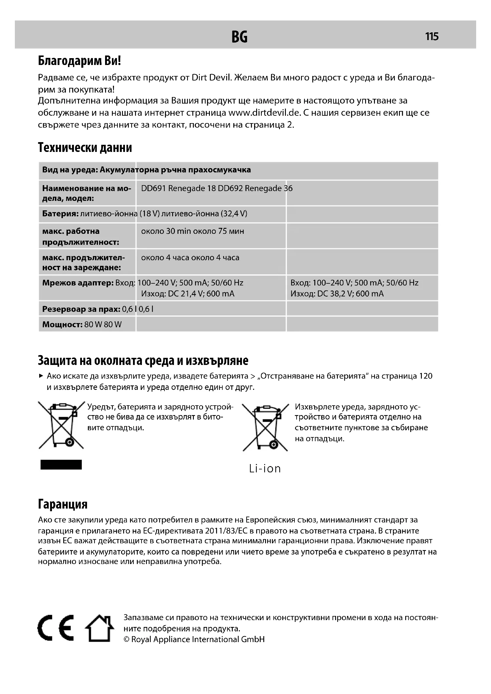 Ако сте закупили уреда като потребител в рамките на Европейския съюз, минималният стандарт за гаранция е прилагането на ЕС-директивата 2011/83/ЕС в правото на съответната страна. В страните извън ЕС важат действащите в съответната страна минимални гаранционни права. Изключение правят батериите и акумулаторите, които са повредени или чието време за употреба е съкратено в резултат на нормално износване или неправилна употреба. Li-ion Запазваме си правото на технически и конструктивни промени в хода на постоян-ните подобрения на продукта.© Royal Appliance International GmbH Технически данни Вид на уреда: Акумулаторна ръчна прахосмукачкаНаименование на мо-дела, модел:DD691 Renegade 18 DD692 Renegade 36Батерия: литиево-йонна (18 V) литиево-йонна (32,4 V)макс. работна продължителност:около 30 min около 75 минмакс. продължител-ност на зареждане:около 4 часа около 4 часаМрежов адаптер: Вход: 100–240 V; 500 mA; 50/60 HzИзход: DC 21,4 V; 600 mAВход: 100–240 V; 500 mA; 50/60 HzИзход: DC 38,2 V; 600 mAРезервоар за прах: 0,6 l 0,6 lМощност: 80 W 80 W Благодарим Ви! Радваме се, че избрахте продукт от Dirt Devil. Желаем Ви много радост с уреда и Ви благода- рим за покупката! Допълнителна информация за Вашия продукт ще намерите в настоящото упътване за обслужване и на нашата интернет страница www.dirtdevil.de. С нашия сервизен екип ще се свържете чрез данните за контакт, посочени на страница 2.BG