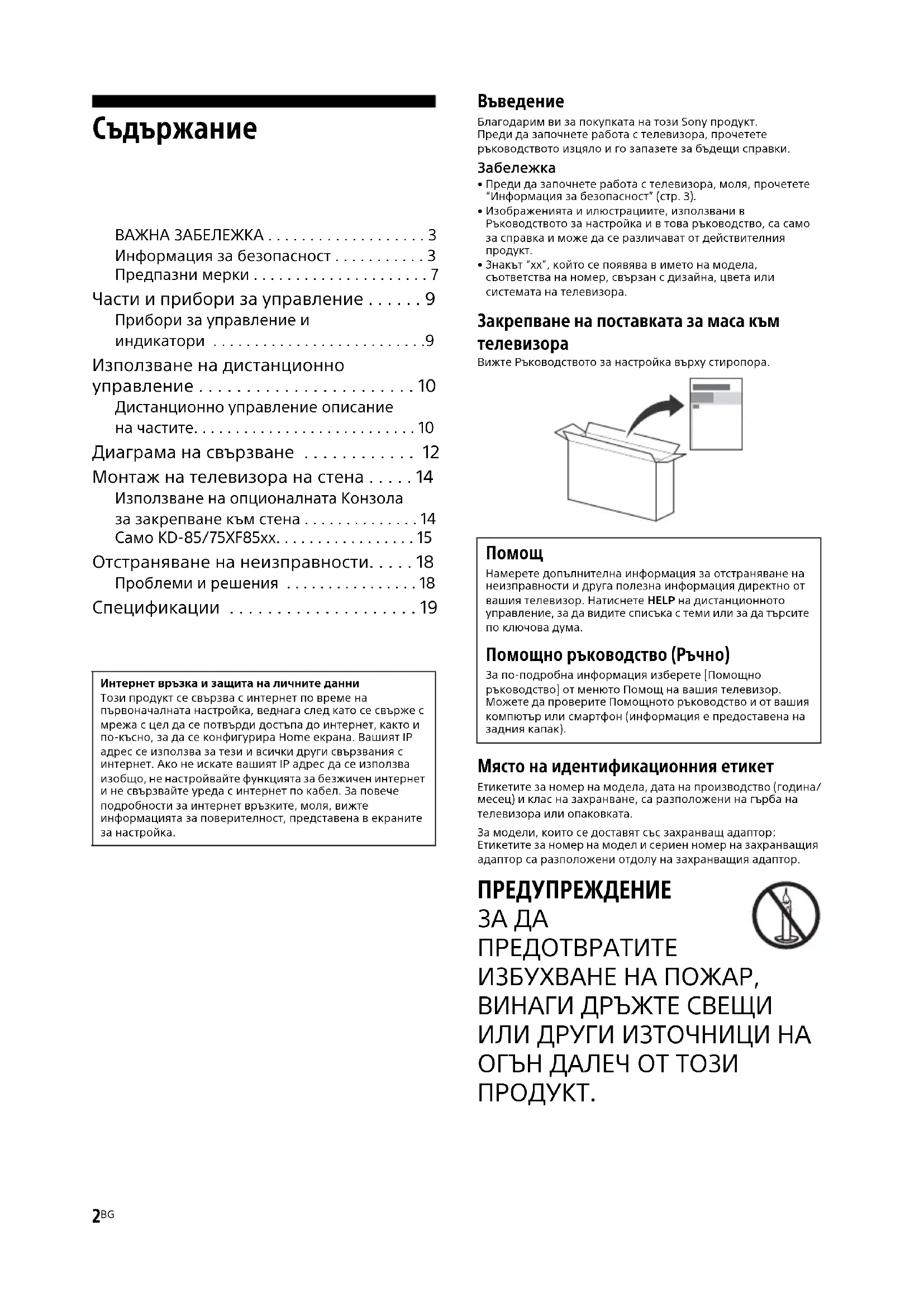 Благодарим ви за покупката на този Sony продукт.Преди да започнете работа с телевизора, прочетете ръководството изцяло и го запазете за бъдещи справки.Забележка• Преди да започнете работа с телевизора, моля, прочетете “Информация за безопасност” (стр. 3).• Изображенията и илюстрациите, използвани в Ръководството за настройка и в това ръководство, са само за справка и може да се различават от действителния продукт.• Знакът “xx”, който се появява в името на модела, съответства на номер, свързан с дизайнa, цвета или системата на телевизора. Закрепване на поставката за маса към