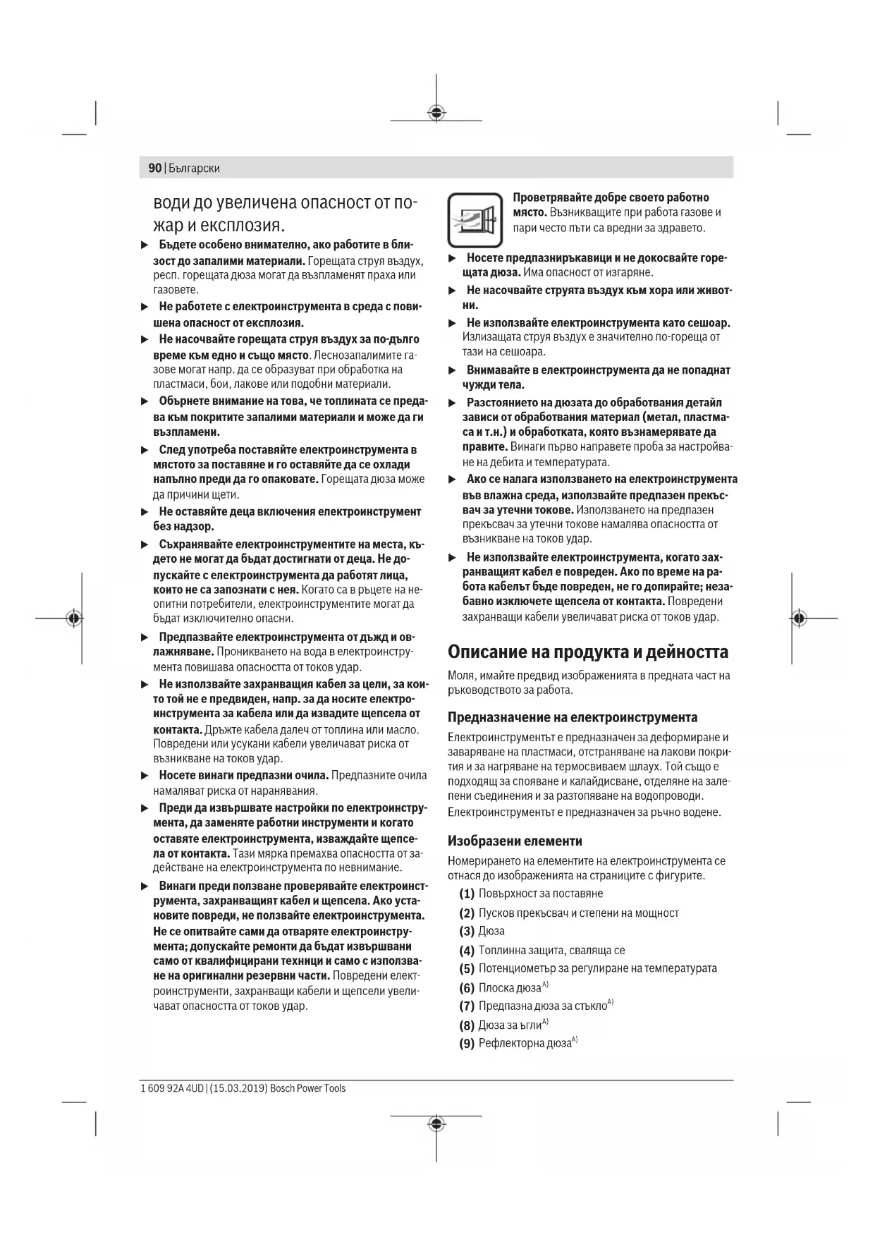 u Работете внимателно с електро- инструмента. Електроинструмен- тът генерира силна топлина, която Bosch Power Tools 1 609 92A 4UD | (15.03.2019)90 | Български води до увеличена опасност от по- жар и експлозия. u Бъдете особено внимателно, ако работите в бли- зост до запалими материали. Горещата струя въздух, респ. горещата дюза могат да възпламенят праха или