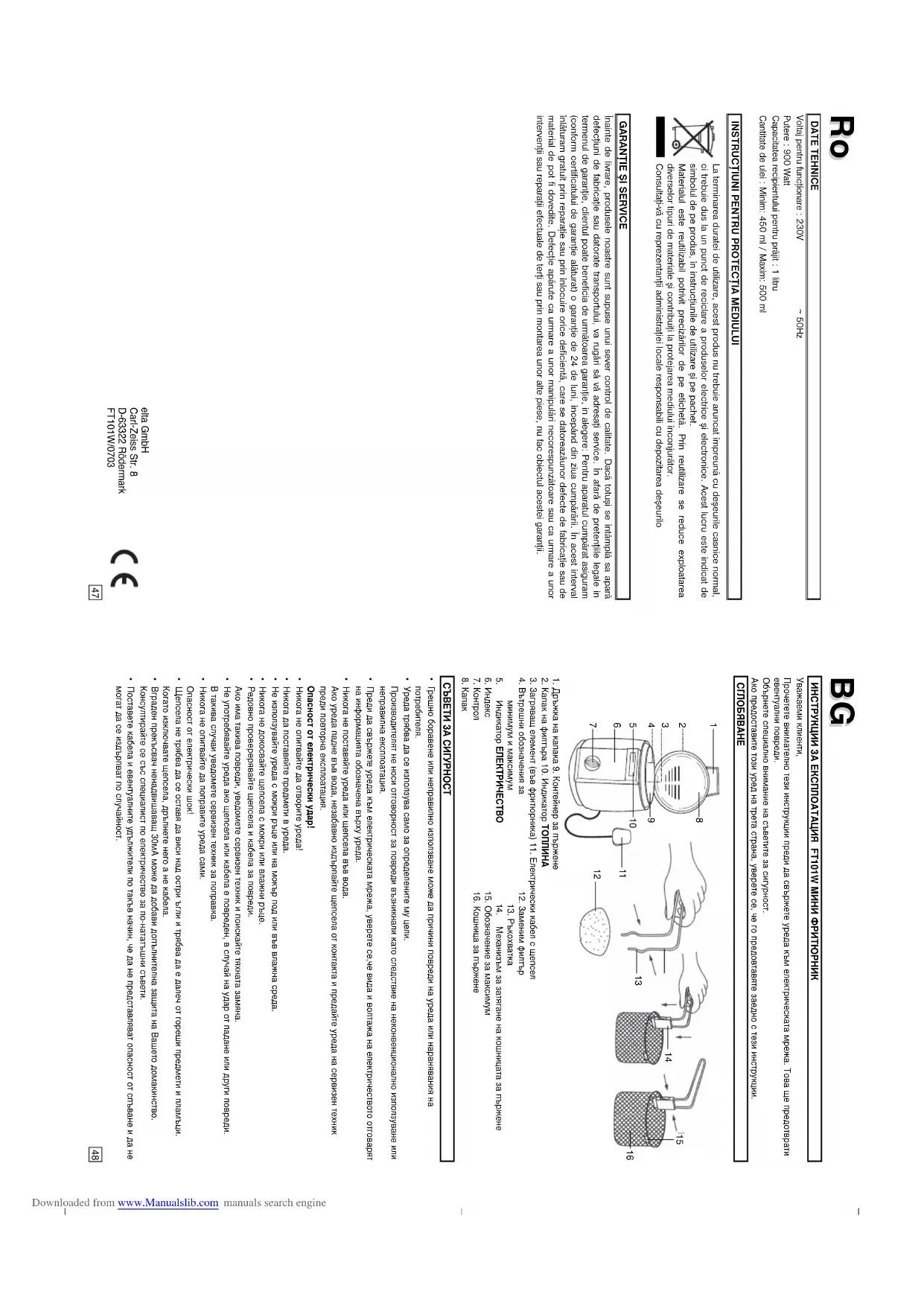 Downloaded from www.Manualslib.com manuals search engineЗа да направите това първо отворете капака на филтъра (2) от капака (8). Извадете старият филтър и поставете включеният заместващ филтър (12). Поставете филтърнят капак обратно. ТЕХНИЧЕСКИ ДАННИ Работен волтаж : 230V~ 50Hz Електрически вход : 900 Watt Капацитет на контейнера за пържене : 1 Liter Количество олио : Минимум: 450ml / Максимум: 500ml ОПАЗВАНЕ НА ОКОЛНАТА СРЕДА Този продукт не трябва да се изхвърля в нормалните депа за отпадъци. Трябва да бъде оставен в съораженя специализиращи в събирането и преработката на електрически и електронни уреди. Символа на опаковката, самият уред, и иструкцията за употреба обозначават това. Материалите се преработват както е обозначено на техните надписи. Чрез преработката на материалите, както и на други материали във Вашето домакинство, Вие допринасяте за опазването на нашата околна среда. Консултирайте се с Вашата месна администрация за да намерите подходящия преработвателен център. ГАРАНЦИЯ И ОБСЛУЖВАНЕ НА КЛИЕНТИ Преди доставката нашите уреди се подлагат на строг качествен контрол. Ако, въпреки всички грижи, е възникнала повреда при производството или транспортирането, Ви молим да занесете обратно уреда на търговеца, от който е закупен. Наред със законовите гаранционни претенции купувачът има право по негов избор на следните гаранционни услуги: За закупения уред даваме 2 години гаранция, считано от деня на продажбата. През този период отстраняваме безплатно, чрез ремонтиране или замяна, всички недостатъци, които безспорно се дължат на дефекти на материала или на производството. Недостатъци, възникнали вследствие на неправилно боравене с уреда, и дефекти, появили се след намеса и поправки от страна на трети лица, както и след монтирането на чужди части, не се обхващат от тази гаранция. ИНСТРУКЦИЯ ПО ЭКСПЛУАТАЦИИ FT101W МИHИФPИTЮPHИЧA Уважаемый покупатель! Внимательно прочтите эту инструкцию, прежде чем подключить устройство к сети, чтобы избежать его повреждений из-за неправильного использования. Обратите особое внимание на указания по безопасности. Если вы захотите передать это устройство третьему лицу, то вместе с устройством необходимо передать и эту инструкцию. КОНСТРУКЦИЯ