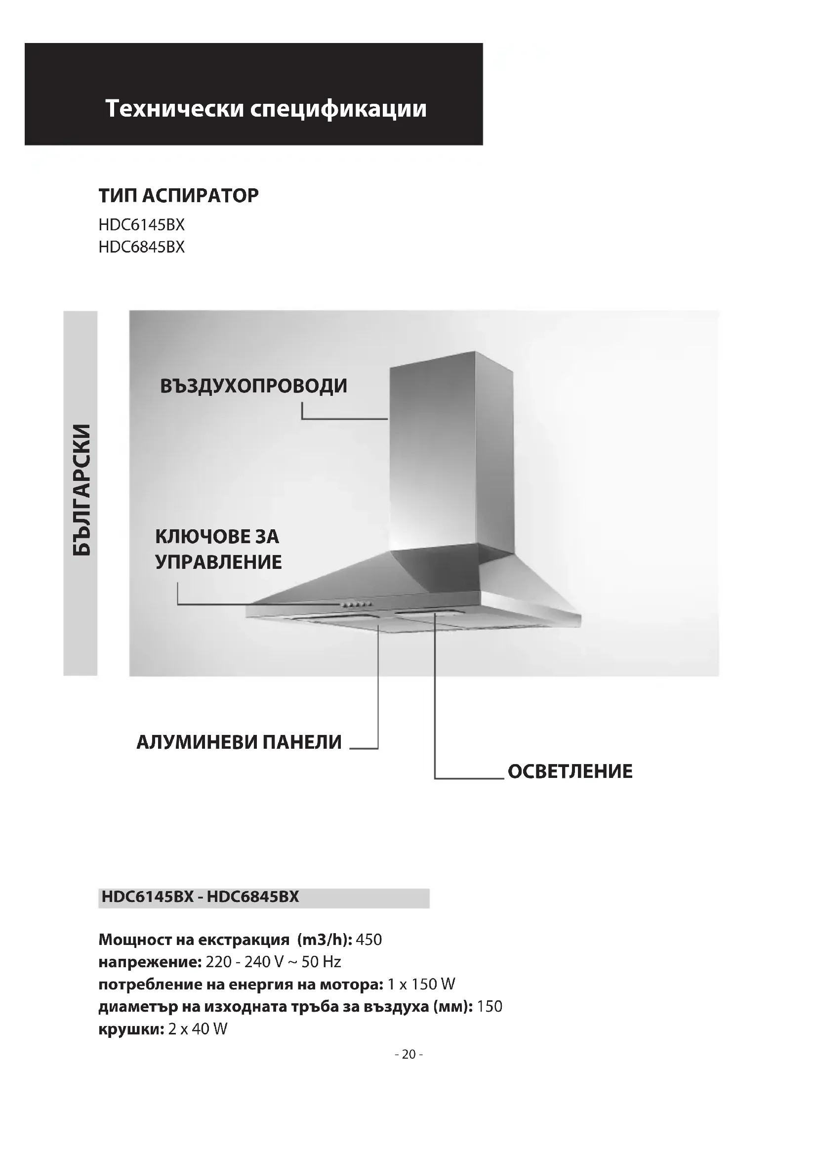 Мощност на екстракция (m3/h): 450 напрежение: 220 - 240 V ~ 50 Hz потребление на енергия на мотора: 1 x 150 W диаметър на изходната тръба за въздуха (мм): 150 крушки: 2 x 40 W