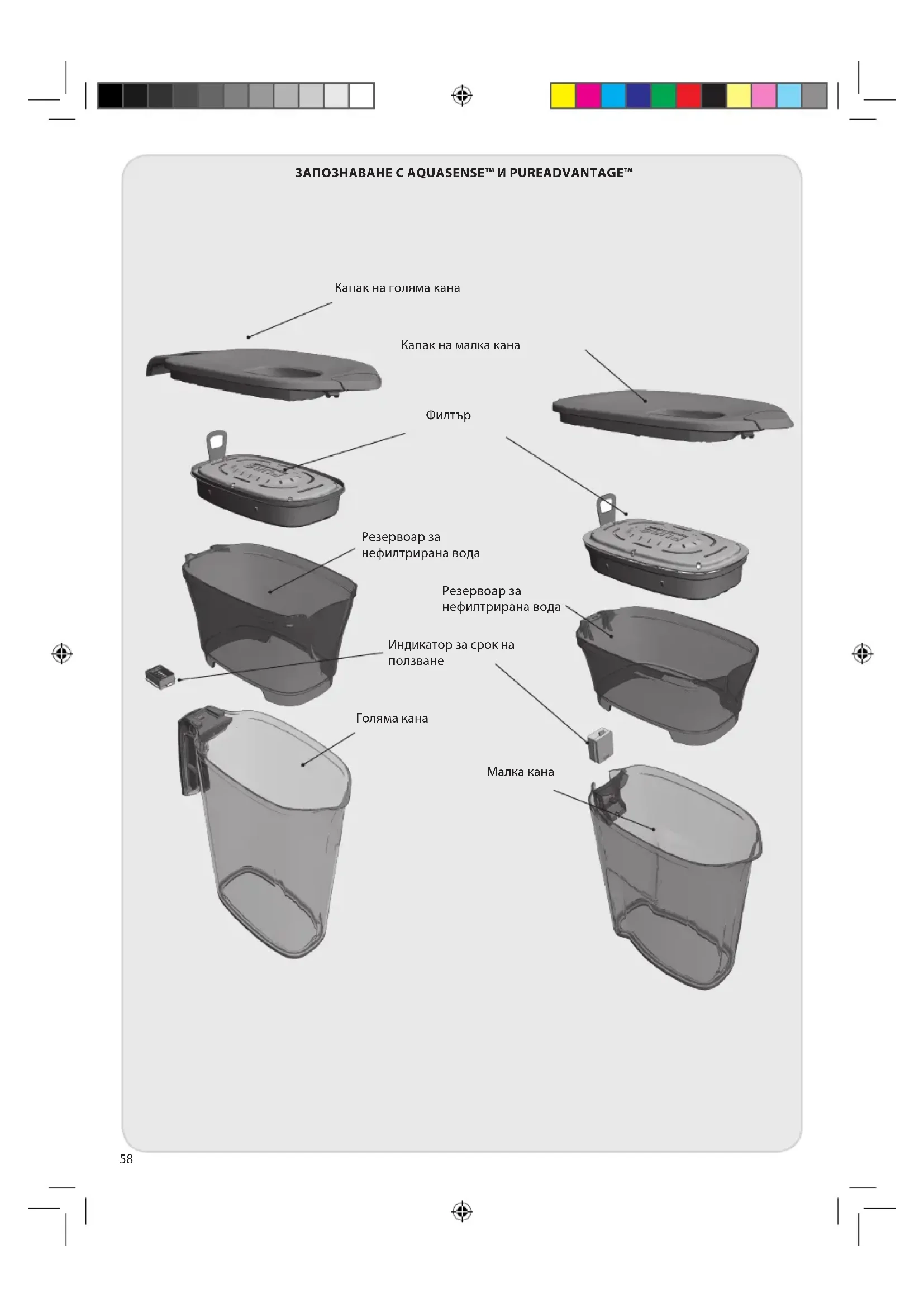 Lavez-vous soigneusement les mains avant de remplacer le filtré PUREADVANTAGE™. - Changez le filtrtre PUREADVANTAGE™ si vous ne l'avez pas utilisé pendant une durée prolongée (par exemple pendant les vacances) ou s'il est resté plus de 24 heures hors du réfrigérateur. Il est recommandé de faire bouillir l'eau du robinet avant de la donneur aux personnes atteintes d'un déficit immunitaire et aux bébés; cette recommandation s'applique également à l'eau filtrée avec PUREADVANTAGETM. Pour des raisons d'hygiene, les composants des filtres PUREADVANTAGE™ sont soumis à un traitement spécifique à base d'argent. Une petite quantité de cette substance peut passer dans l'eau. Cette quantité respecte cependant les limites fixées par l'Organisation mondiale de la santé (OMS) et par la directive europeenne n°98/83/CE relative à la qualité des eaux destinées à la consommation humaine.