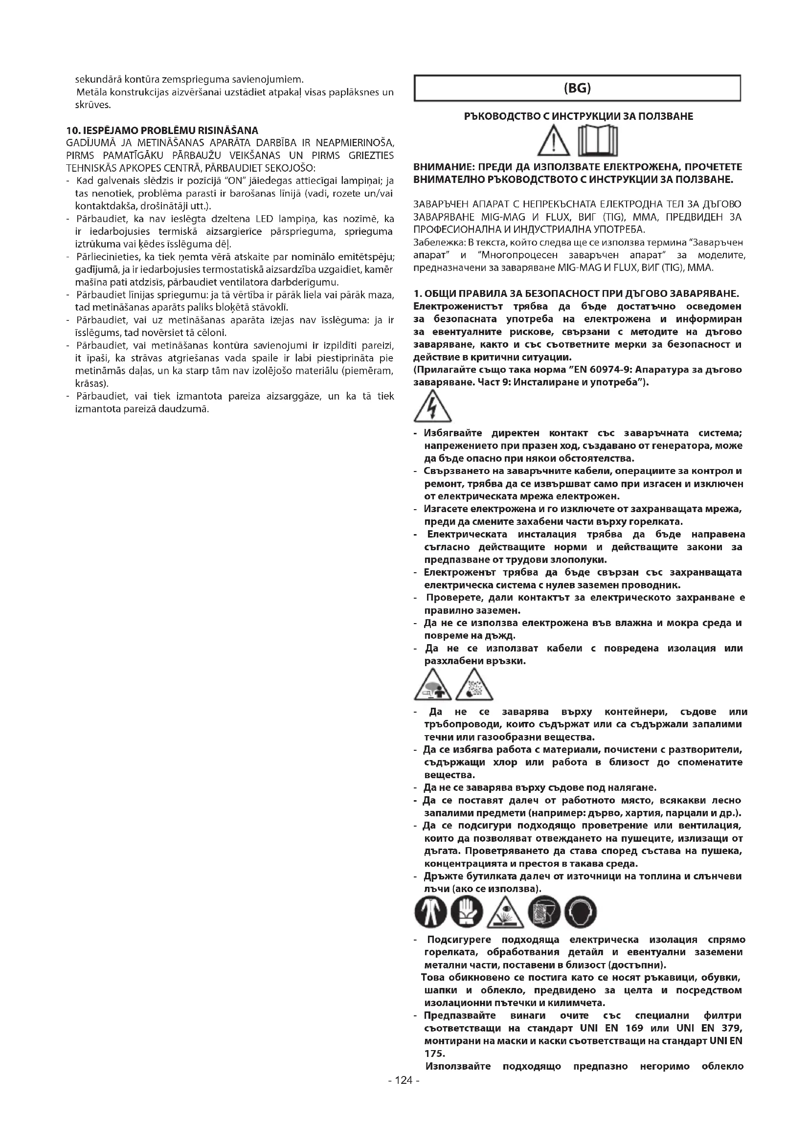Използвайте подходящо предпазно негоримо облекло- 125 - (съответстващо на стандарт UNI EN 11611) и ръкавици за заваряване (съответстващи на стандарт UNI EN 12477) като избягвате да излагате кожата на въздествито на ултравиолетовите и инфра червени лъчи, които се образуват от дъгата; трябва да се вземат и по-обширни предпазни мерки за други лица, които се намират в близост до дъгата чрез екрани или завеси, които възпрепятстват отразяването. - Образуван шум: Ако поради особено интензивни заваръчни операции се достигне ниво на лична ежедневна експозиция (LEPd) равна или по-голяма на 85 dB(A), става задължителна употребата на подходящи средства за лична защита (Taб. 1). - Преминаването на заваръчен ток предизвиква появата на електромагнитни полета (EMF), които са локализирани около заваръчната система. Електромагнитните полета могат да взаимодействат с някои медицински апаратури (напр. пейс-мейкъри, респиратори, метални протези и т.н.). Трябва да се вземат нужните предпазни мерки за притежателите на такива апарати. Например да се забрани достъпът до зоната, където се използва заваръчният апарат. Този заваръчен апарат отговаря на изискванията на техническите стандарти за продукт, който се използва единствено в промишлена среда и с професионални цели. Не се гарантира съответствие с основните базови граници на експозиция на хора на електромагнитни полета в домашна среда. Операторът трябва да използва следните процедури, така че да се намали експозицията на електромагнитни полета: - Фиксирайте заедно, колкото може по-близо двата заваръчни