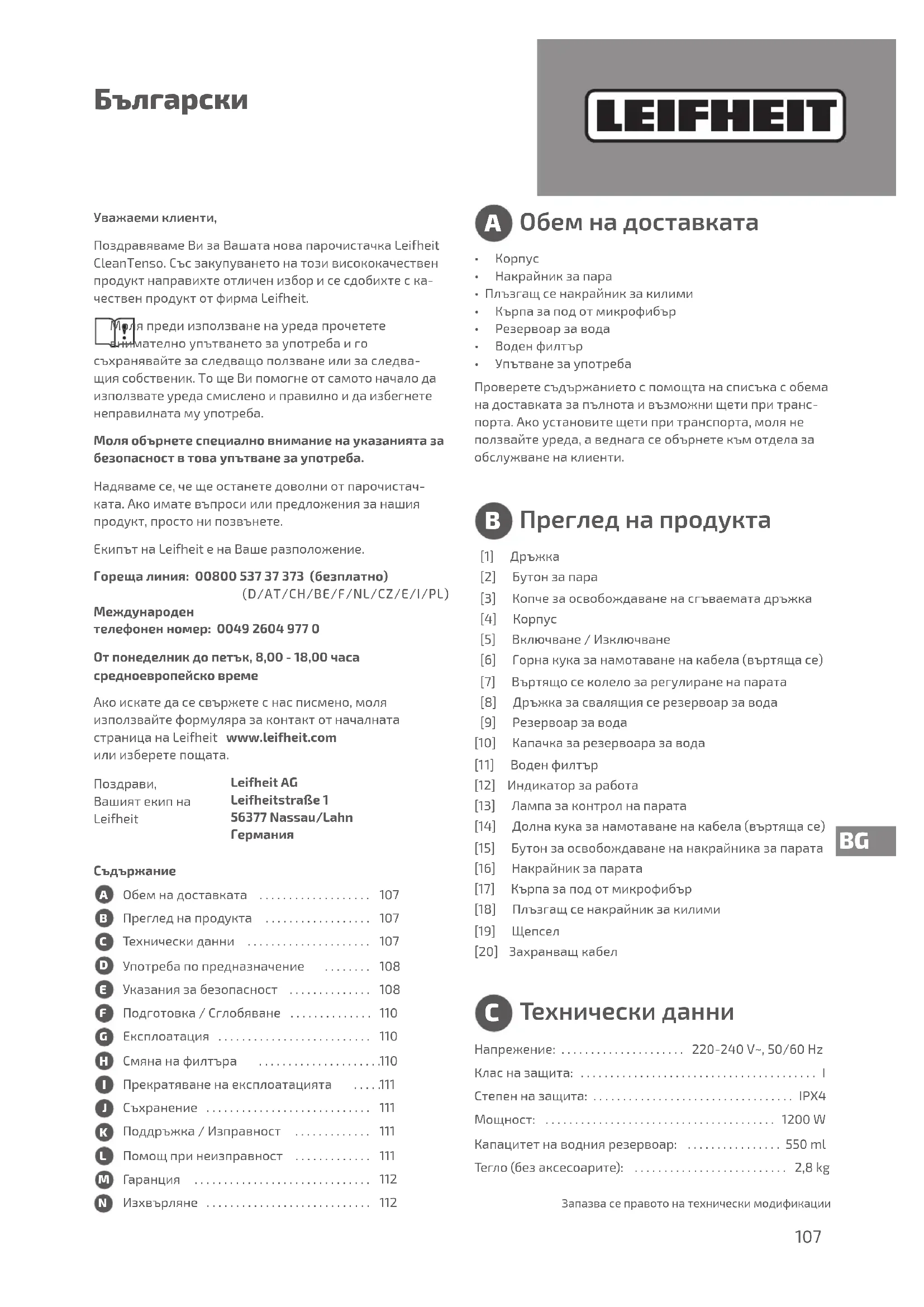 - Упътванезаупотреба Проверетесъдържаниетоспомощтанасписъкасобема надоставкатазапълнотаивъзможнищетипритранс- порта.Акоустановитещетипритранспорта,моляне ползвайтеуреда,аведнагасеобърнетекъмотделаза обслужваненаклиенти. Уважаемиклиенти, ПоздравявамеВизаВашатановапарочистачкаLeifheit CleanTenso.Съсзакупуванетонатозивисококачествен продуктнаправихтеотличенизборисесдобихтеска- чественпродуктотфирмаLeifheit. Моляпредиизползваненауредапрочетете внимателноупътванетозаупотребаиго съхранявайтезаследващоползванеилизаследва- щиясобственик.ТощеВипомогнеотсамотоначалода използватеуредасмисленоиправилноидаизбегнете неправилнатамуупотреба. Моля обърнете специално внимание на указанията за безопасност в това упътване за употреба. Надявамесе,чещеостанетедоволниотпарочистач- ката.Акоиматевъпросиилипредложениязанашия продукт,простонипозвънете. ЕкипътнаLeifheitенаВашеразположение. Гореща линия: 00800 537 37 373 (безплатно) (D/AT/CH/BE/F/NL/CZ/E/I/PL) Международен телефонен номер: 0049 2604 977 0 От понеделник до петък, 8,00 - 18,00 часа средноевропейско време Акоискатедасесвържетеснасписмено,моля използвайтеформуляразаконтактотначалната страницанаLeifheit www.leifheit.com илиизберетепощата.