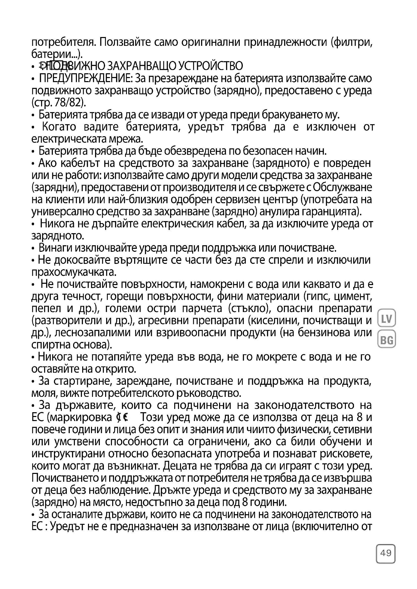 - ПРЕДУПРЕЖДЕНИЕ: За презареждане на батерията използвайте само подвижното захранващо устройство (зарядно), предоставено с уреда (стр. 78/82).