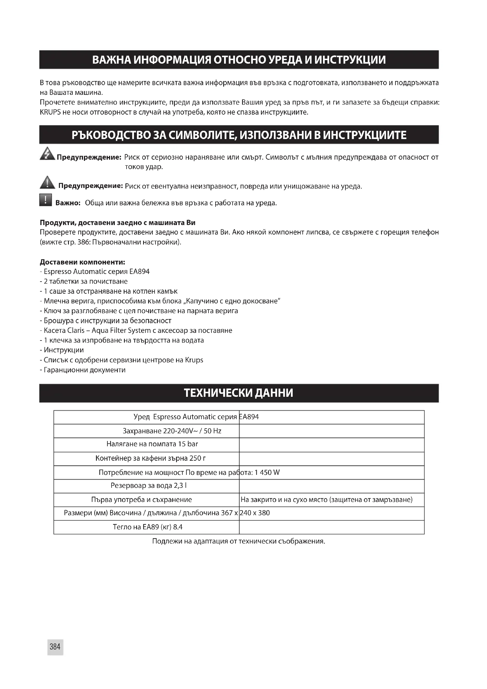 Важно: Обща или важна бележка във връзка с работата на уреда. Продукти, доставени заедно с машината Ви Проверете продуктите, доставени заедно с машината Ви. Ако някой компонент липсва, се свържете с горещия телефон (вижте стр. 386: Първоначални настройки). Доставени компоненти: - Espresso Automatic серия EA894 - 2 таблетки за почистване - 1 саше за отстраняване на котлен камък - Млечна верига, приспособима към блока „Капучино с едно докосване” - Ключ за разглобяване с цел почистване на парната верига - Брошура с инструкции за безопасност - Касета Claris – Aqua Filter System с аксесоар за поставяне - 1 клечка за изпробване на твърдостта на водата - Инструкции - Списък с одобрени сервизни центрове на Krups - Гаранционни документи ТЕХНИЧЕСКИ ДАННИ Уред Espresso Automatic серия EA894 Захранване 220-240V~ / 50 Hz Налягане на помпата 15 bar Контейнер за кафени зърна 250 г Потребление на мощност По време на работа: 1 450 W Резервоар за вода 2,3 l Първа употреба и съхранение На закрито и на сухо място (защитена от замръзване) Размери (мм) Височина / дължина / дълбочина 367 x 240 x 380 Тегло на EA89 (кг) 8.4 Подлежи на адаптация от технически съображения. 384ОПИСАНИЕ НА УРЕДА A Дръжка на капака на резервоара за водаB Резервоар за водаC Съд за събиране на утайката от кафеD Изходи за изтичане на кафето с възможност за регулиране на височинатаE Решетка и подвижна ваничка за отцежданеF Капак на резервоара за кафе на зърнаG Подвижен блок за капучино One Touch CappuccinoG1 Ключ за разглобяване за почистване на парната верига G2 Блок за капучино с едно докосванеH Тръбичка за мляко и смесителI Поплавък за нивото на водата Резервоар за кафе на зърнаJ Бутон за регулиране на степента на смиланеK Гърловина за таблетки за почистванеL Метална кафемелачка Панел за управлениеM OLED екранN Бутон за включване/изключванеO Бутони за изборПояснения:Ваничката за отцеждане позволява да се събира вода или кафе, което изтича от уреда по време на и след приготвяне на напитки. Важно е тя винаги да е поставена на мястото си и редовно да се изпразва или това да става, когато се указва от поплавъците.
